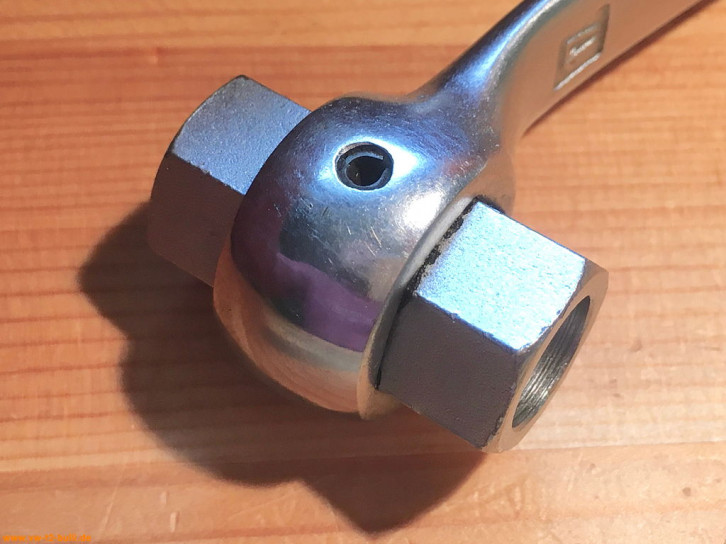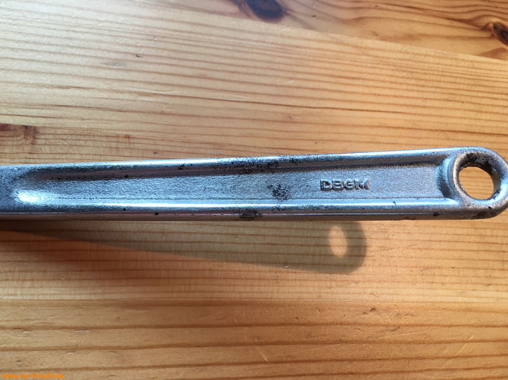 Dieser 200 mm lange Doppelringschlüssel mit 17 mm diente zum Anziehen und Lösen der Schrauben der vorderen Getriebeaufhängung und 22 mm zum Ein- und Ausbau des Rückfahr-Scheinwerfer-Schalters aller Typen ab Modelljahr 1966.
