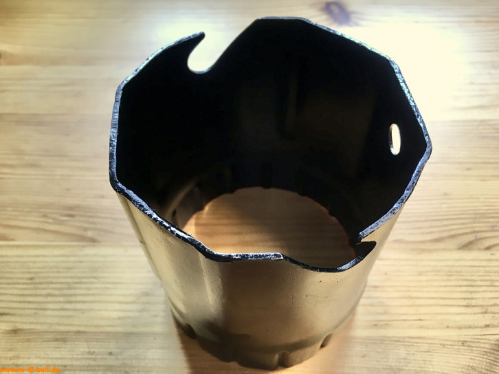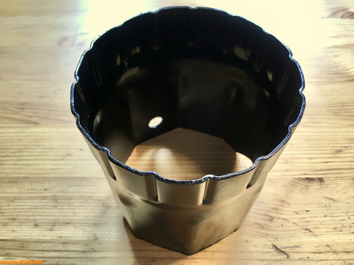 Ölfilterschlüssel für Typ 4 Motoren. Zum Lösen wird in die beiden Schlitze ein 300 mm langer und 13 mm dicker Stecker/Stange "768-4" eingesetzt als Hebelarm. Das Anziehen des Filters soll nur von Hand erfolgen mit max 1,5 kpm bzw. 15 Nm.