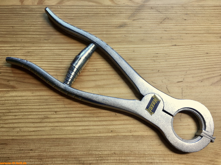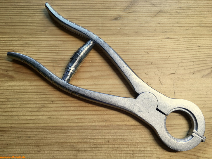 Diese Spezialzange gab es schon ab 1950 bis 1954 als "576" bzw. ab 1958 als "2576" bis ca. 1979. Diese Version hier ist vor 1965 wegen der Groß- und Kleinschreibung der Marke. Diese hier ist defekt: jemand hat die rechtwinklig abgebogene Zangenspitzen entfernt. Vielleicht finde ich ja noch ein besseres Exemplar.