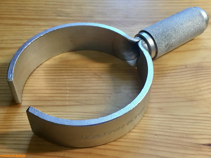 Dieses 150 mm Kolbenringspannband für ca. 85,5 mm Kolbendurchbmesser bei 1600 ccm dient dem Zusammendrücken der Kolbenringe beim Aufsetzen der Zylinder. Es entspricht dem Volkswagen-Sonderwerkzeug "VW 123c".