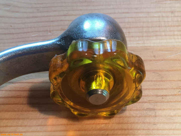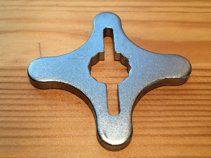 Dieses Flügelrad aus extradickem Blech kann von hinten auf die Flügelmutter des Kupplungszuges aufgesteckt werden zur einfacheren Drehung der schlecht zugänglichen Flügelmutter. Es hat einen 14mm Innenzwölfkant für Sechskantmuttern und einen Schlitz für die Kupplungsflügelmutter.