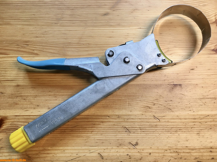 Diese ohne Spannband 240 mm lange Spannzange für 70 bis 100 mm Kolbenringdurchmesser kann verwendet werden für die VW Typen 1, 2, 3 und 4 und weitere. Das Spannband kann mit dem Hebel gespannt und gelöst werden - und auch ausgehakt.
