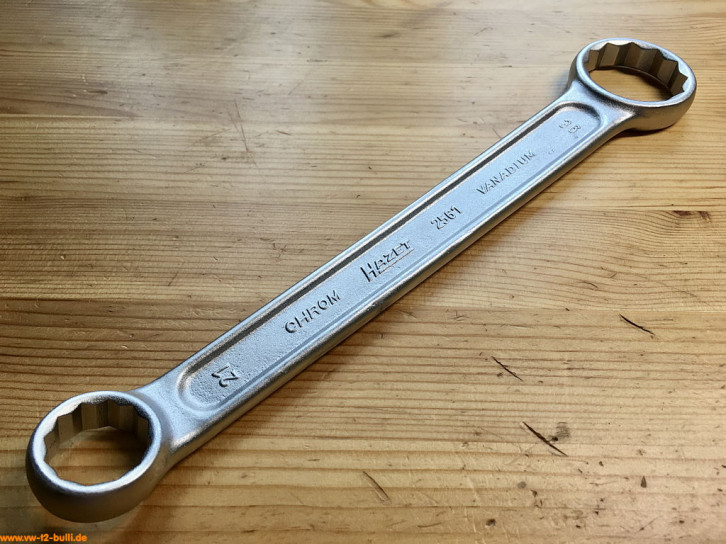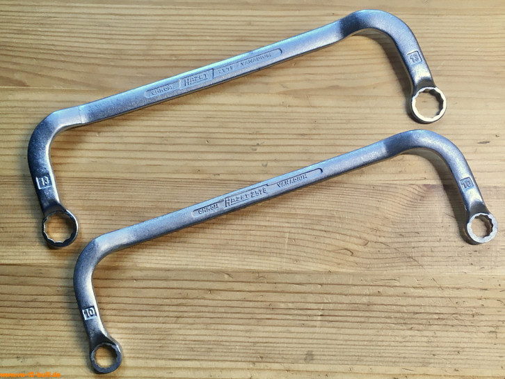 Diese 6 Stück 240 mm langen, einseitigen Maulschlüssel in den Größen 24, 27 und 32 mm mal als flache, gerade Variante "a" und mal gebogene Variante "b" dienten verschiedenen Aufgaben. Die 27 mm Variante entspricht dem Volkswagen-Sonderwerkzeug "VW 113", die 32 mm dem "VW 113a" und die 24 mm dem "VW 113b". Die 24 mm a & b dienten bei Typ 1 und 3 zum Einstellen der Vorderradlager. Die 27 mm a & b zum Einstellen der Vorderradlager der Nachstellhülse der Lenkspindel (Spindellenkung) bei Typ 1 und 2. Der 27 mm a auch für die Befestigungsschraube der Keilriemenscheibe bei Typ 1. Und die 32 mm a & b zum Einstellen der Vorderradlager Typ 2 T1. Die 3 gebogenen Varianten waren Teil der HAZET Werkstattausrüstung für luftgekühlte VWs.