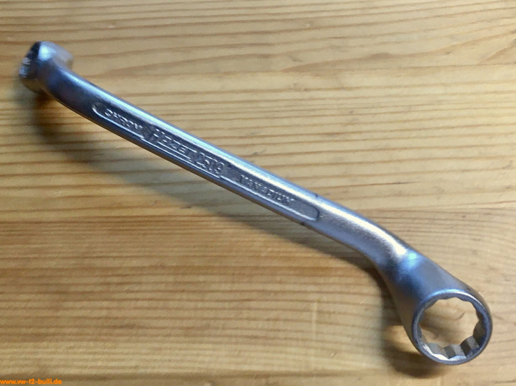Der gebogene 330 mm lange Spezialschlüssel mit 13 mm Schlüsseln diente für Befestigungsschrauben des Deckels am Achsantrieb und des Lagerdeckels am Achsrohr (Typ 1, 2, 3, 4), ferner für Befestigungsschrauben des Auspufftopfes am Zylinderkopf von oben nach Abnehmen des Motorabdeckbleches (Typ 1, 2, 3).