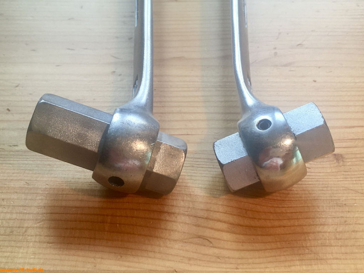 Hier zwei leicht unterschiedliche Versionen. Bei einem steht HAZET am Schlüssel aussen/unten, bei einem im Schieber. Bei einem steht Germany in der gleichen Schriftgröße, einem in kleinerer Schrift.