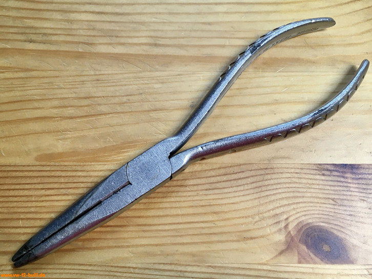Diese 185 mm lange Sprengringzange mit rechtwinklig abgebogene Zangenspitzen dient verschieden Aufgaben so zum Abnehmen und Aufsetzen des Sicherungsringe am Kolbenbolzen bei VW Typ 1, 2, 3 und 4 oder des Deckelverschlusses am Handschuhkasten bei VW Typ 1 und 3. Sie gehörte zum VW Werksortiment.