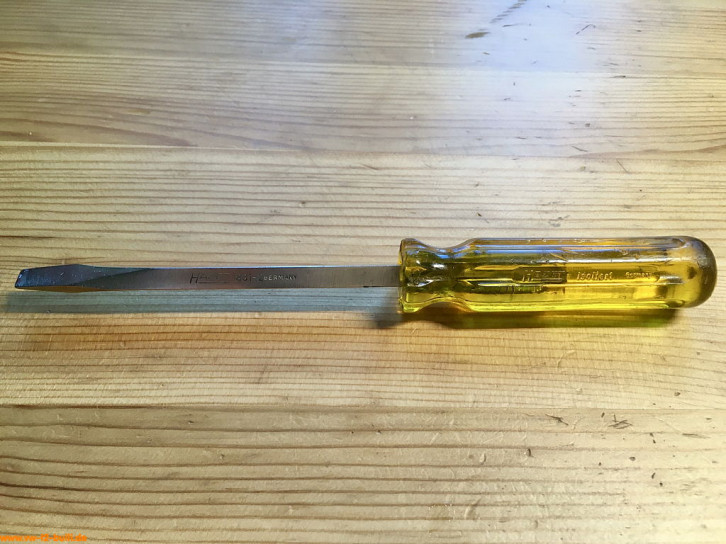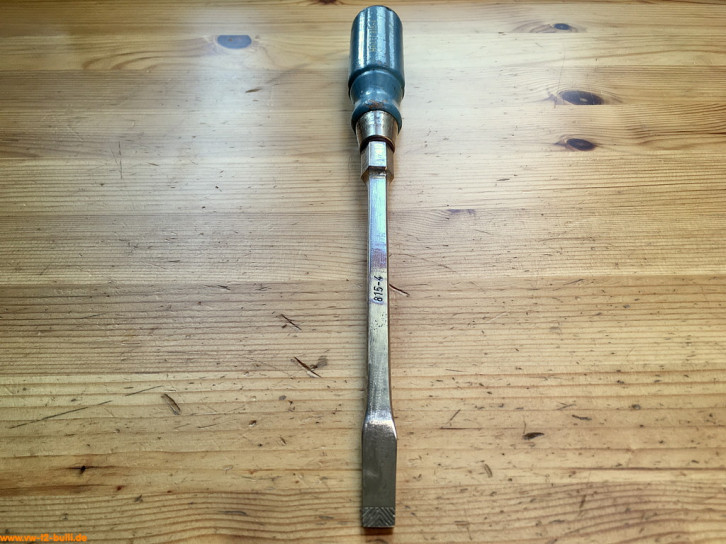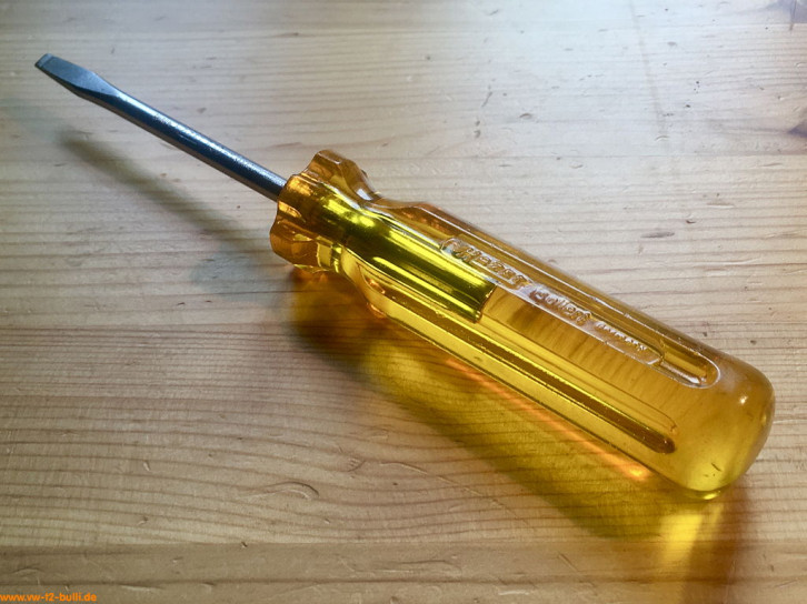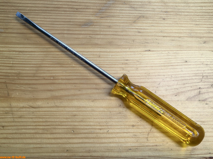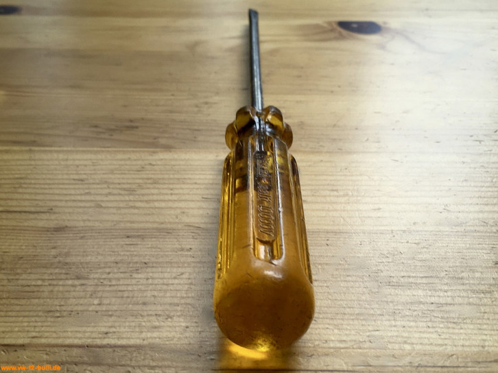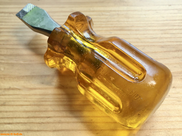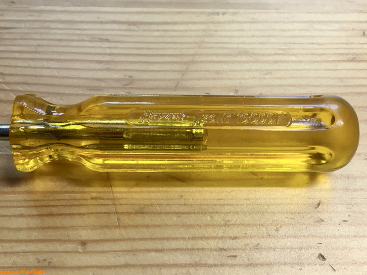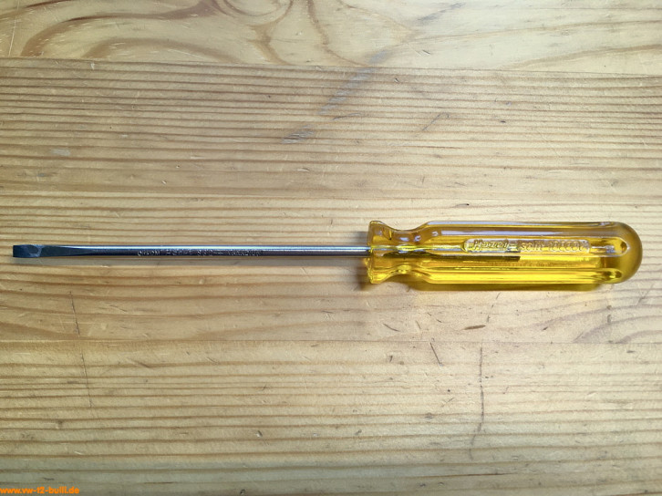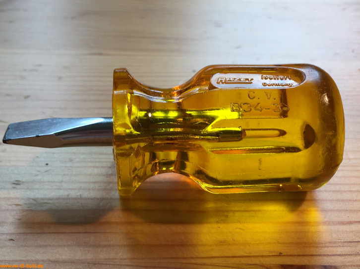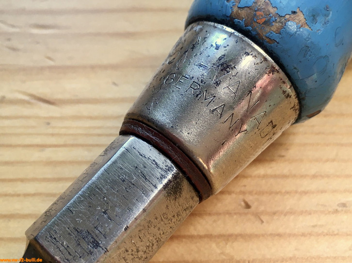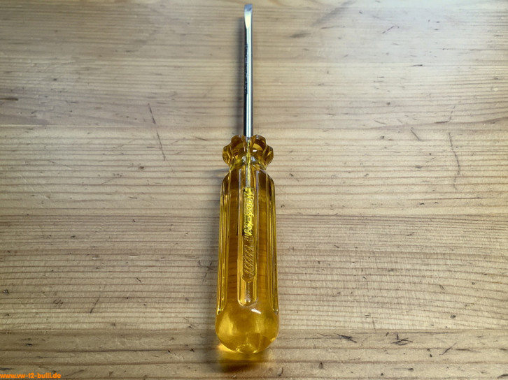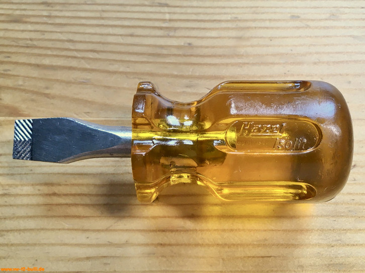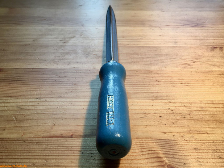 Dieser kurze Schraubendreher für Vergaser gehörte zur HAZET Werkstattausrüstung für luftgekühlte VW und auch andere Fahrzeuge. Die Länge vor dem Griff ist 25 mm, die Breite der Spitze ist 8 mm.