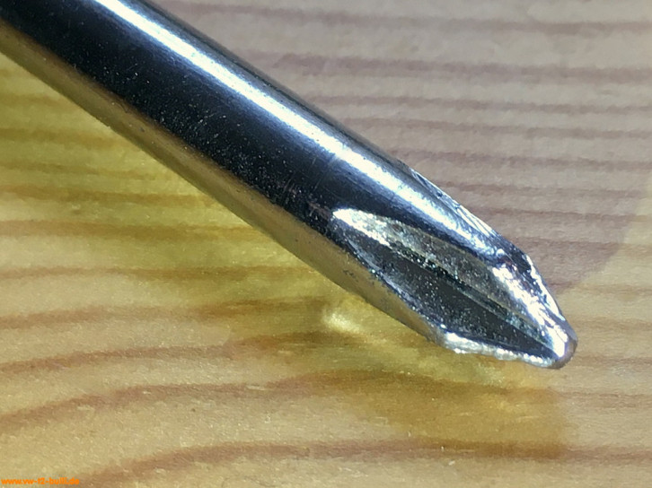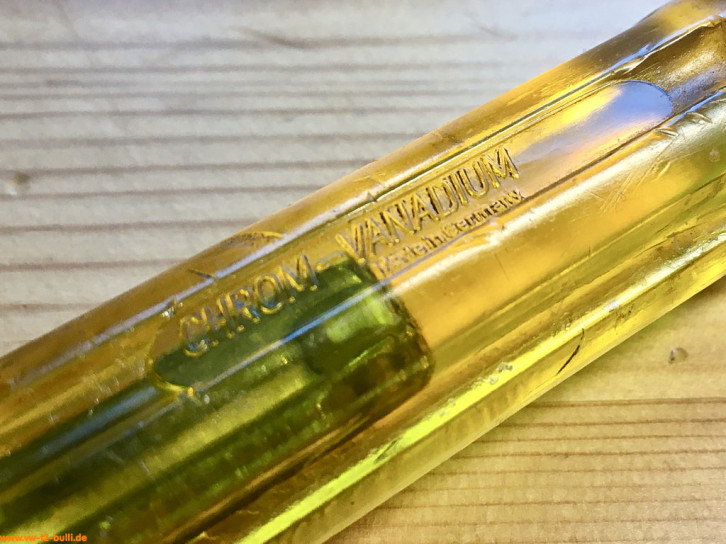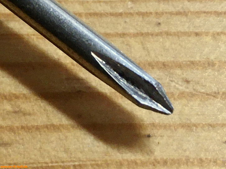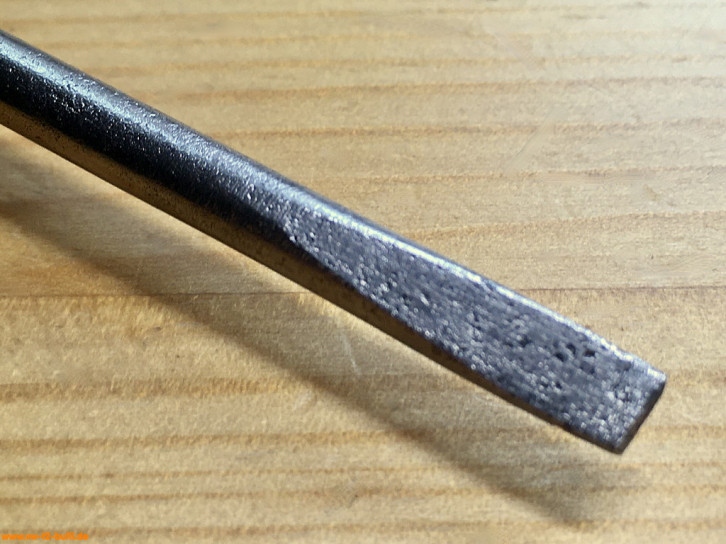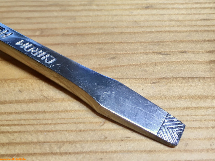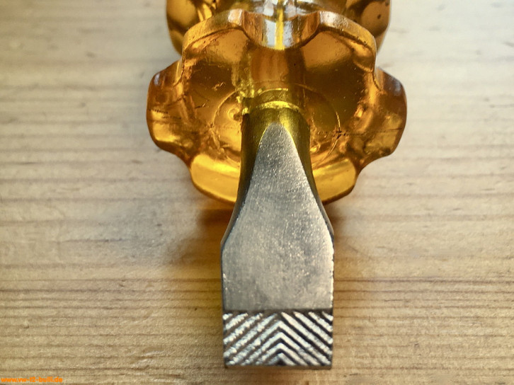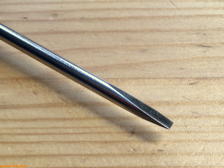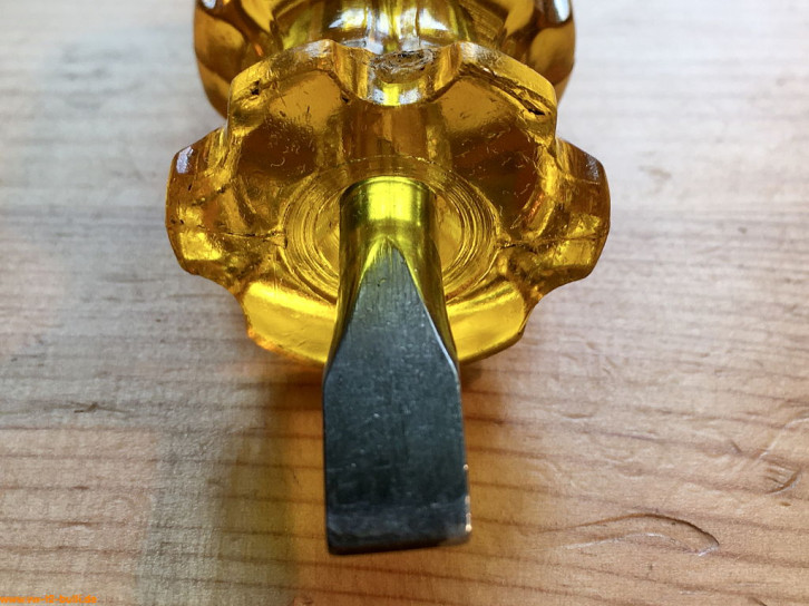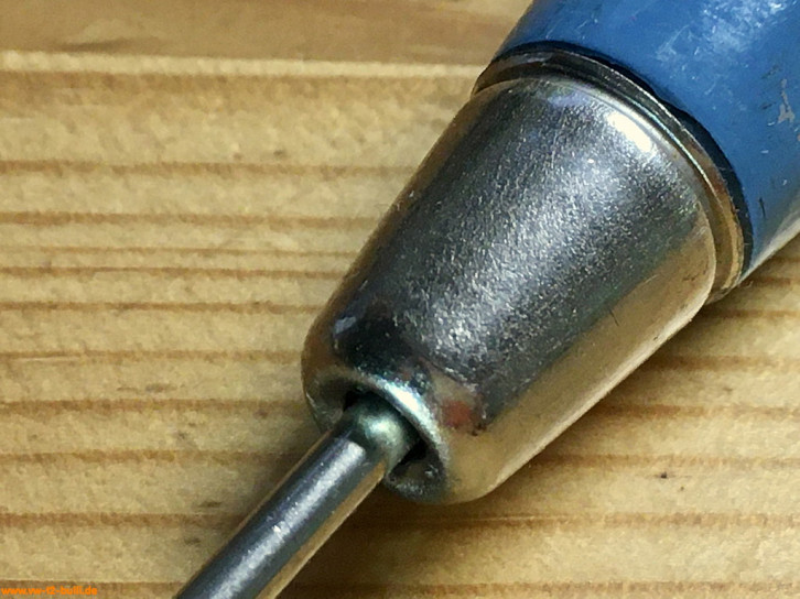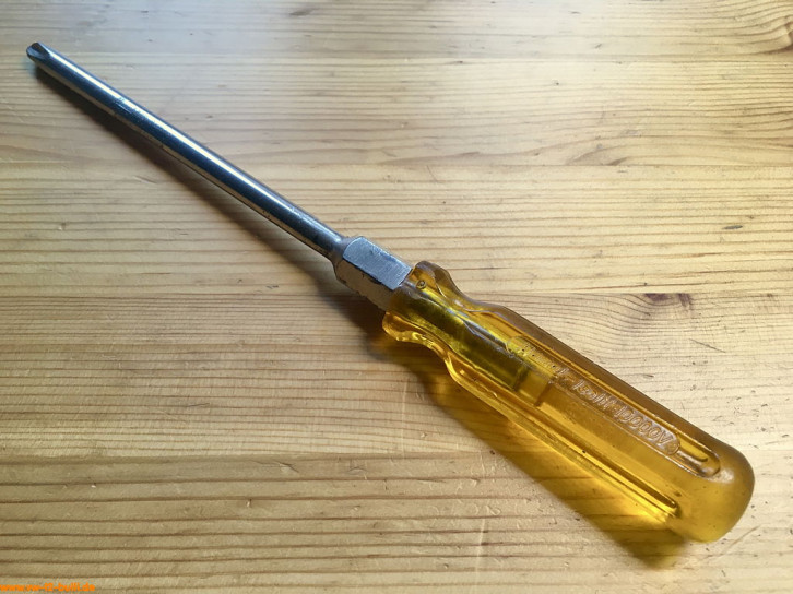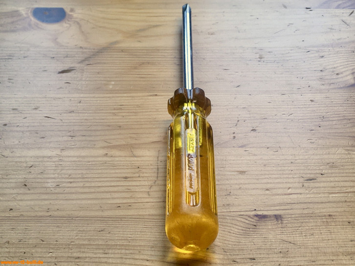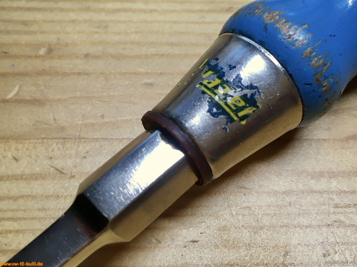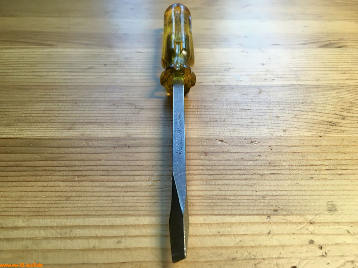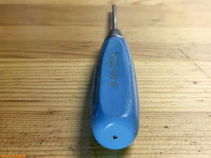 Dieser kurze Schraubendreher für Vergaser gehörte zur HAZET Werkstattausrüstung für luftgekühlte VW und auch andere Fahrzeuge. Die Länge vor dem Griff ist 25 mm, die Breite der Spitze ist 8 mm.
