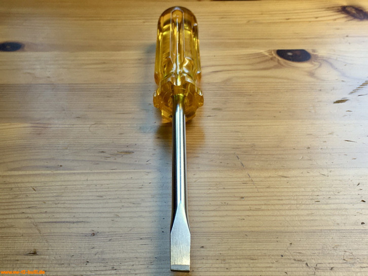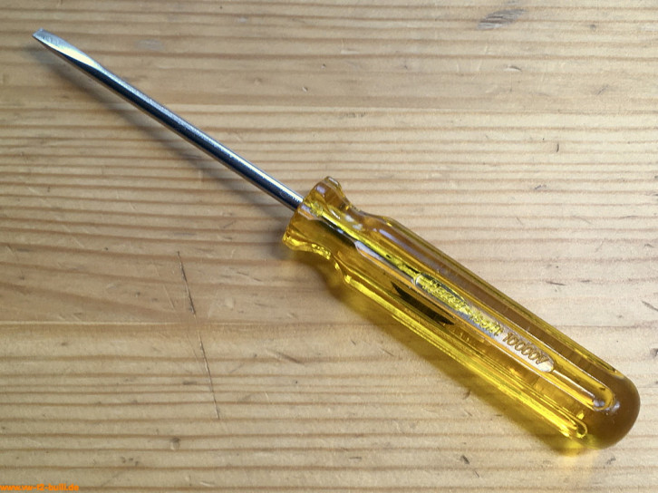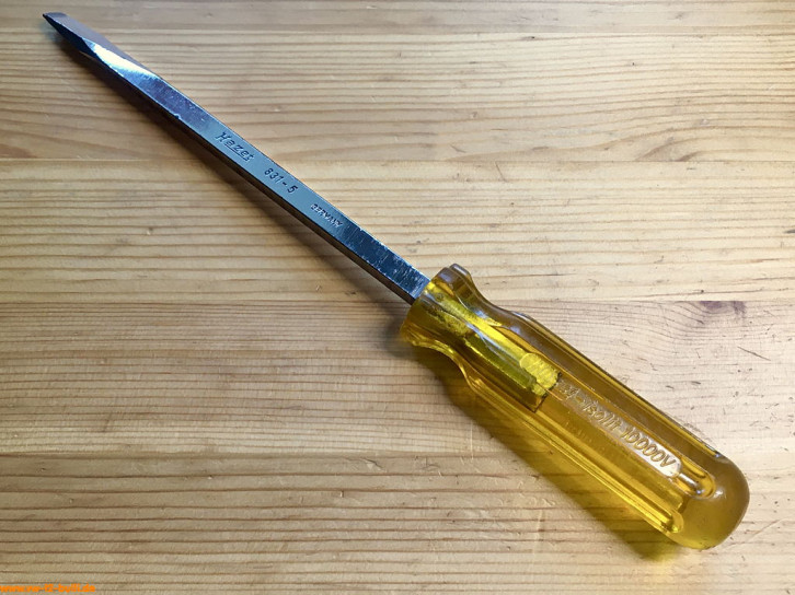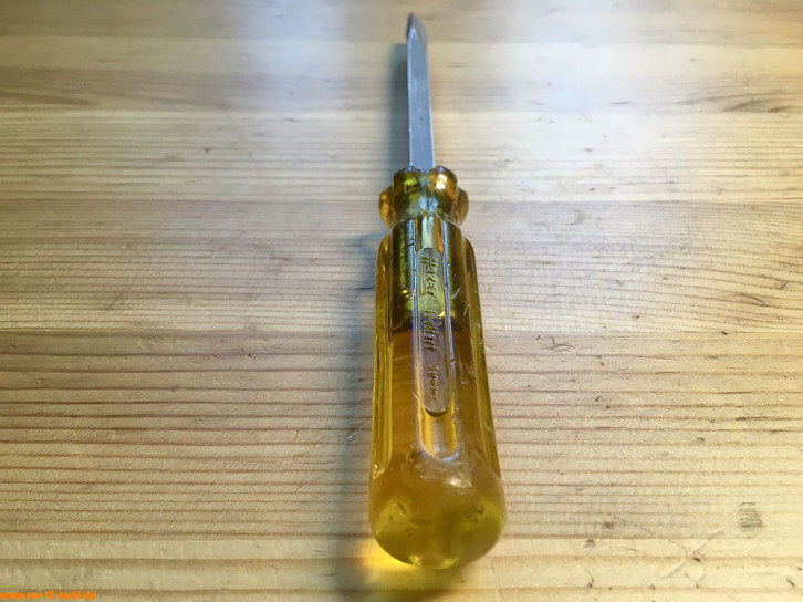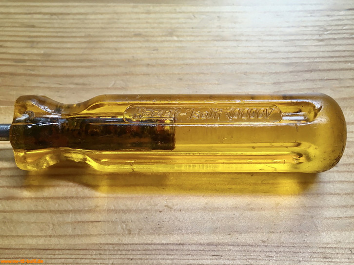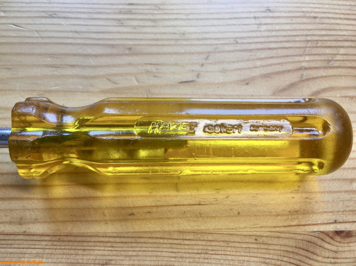 Dieser kleine Schraubendreher mit runder Klinge und Transparentgriff in gelb ist isoliert bis 10000V. Für VW Werkzeugschränke hatte HAZET damals eher die 831-2 mit Vierkantklinge oder längeren 832-4 vorgesehen - heute selten im guten Zustand. Die Länge vor dem Griff ist 75 mm, die Breite der Spitze ist 5 mm.