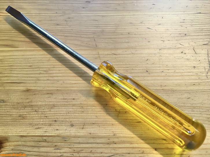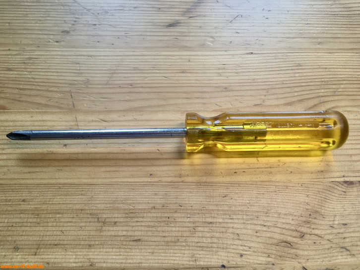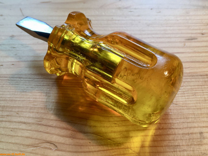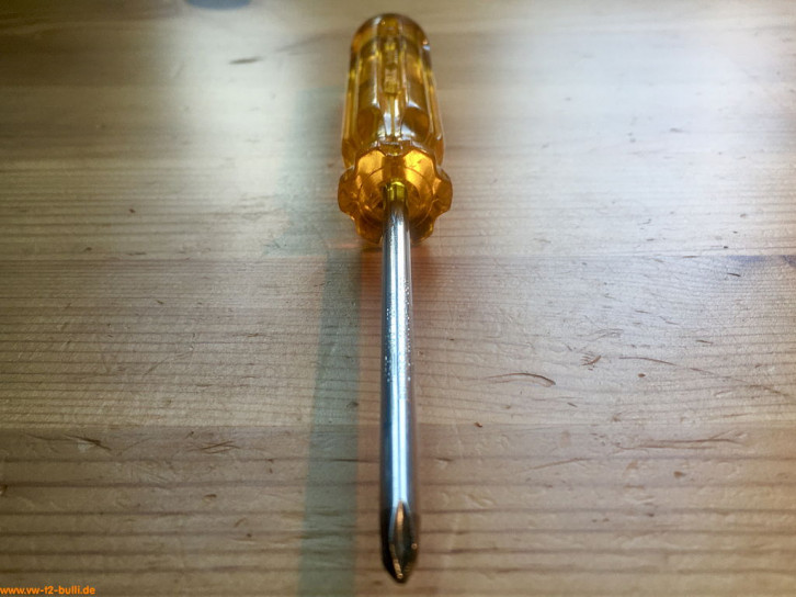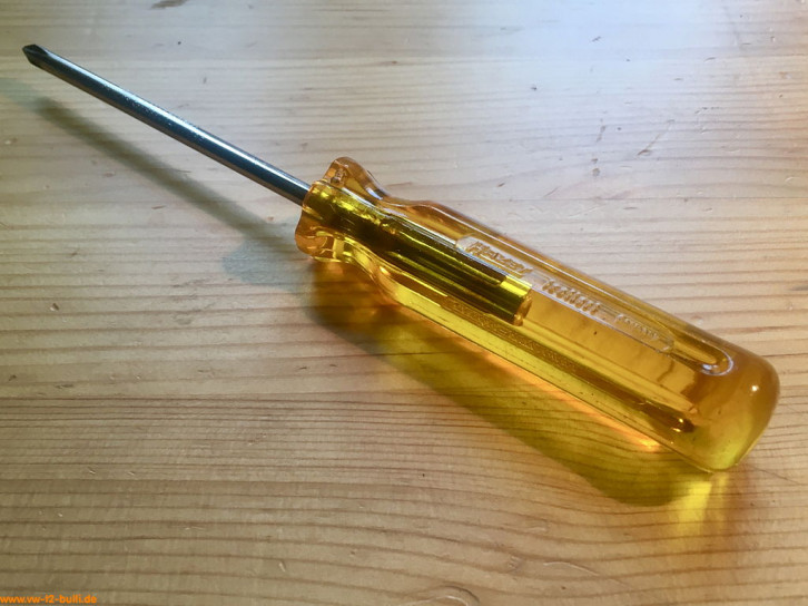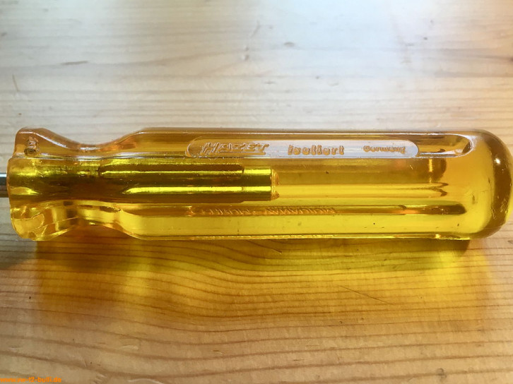 Dieser Schraubendreher DIN 5262 für Kreuzschlitzschrauben (Phillips Recess) mit runder Klinge und Transparentgriff in gelb ist isoliert bis 10000V und gehörte zur HAZET Werkstattausrüstung für luftgekühlte VW und auch andere Fahrzeuge. Die Länge vor dem Griff ist 100 mm, Gesamtlänge 195 mm, die Spitze ist für DIN 5262 - Größe 2 (USA 5-10).