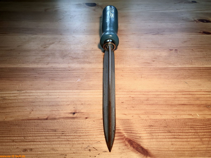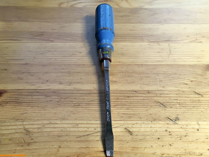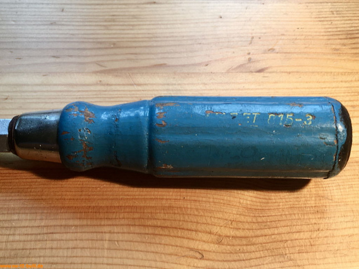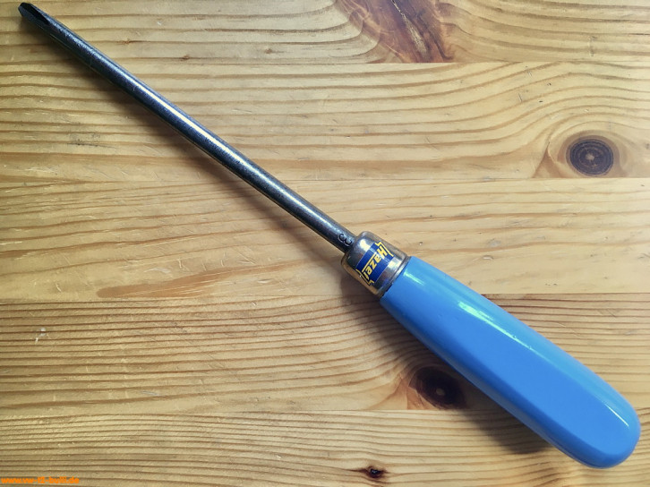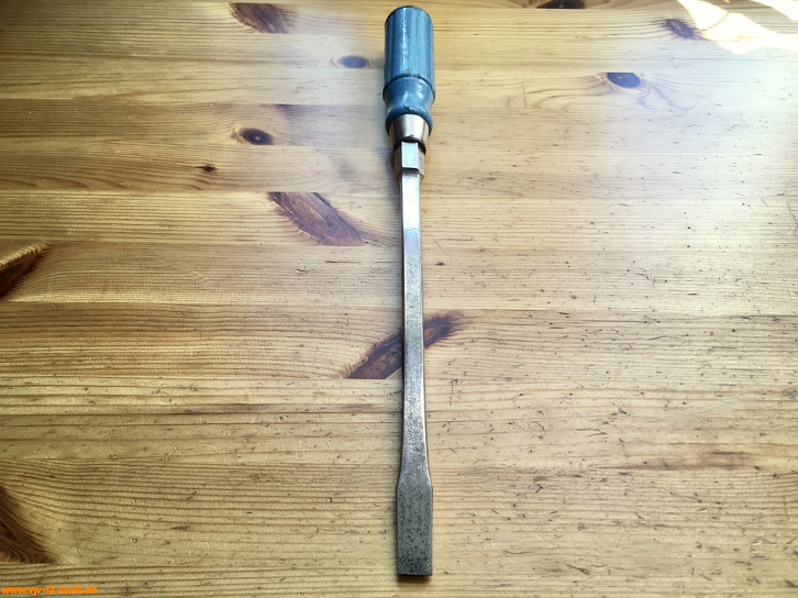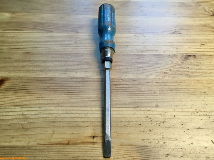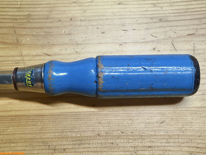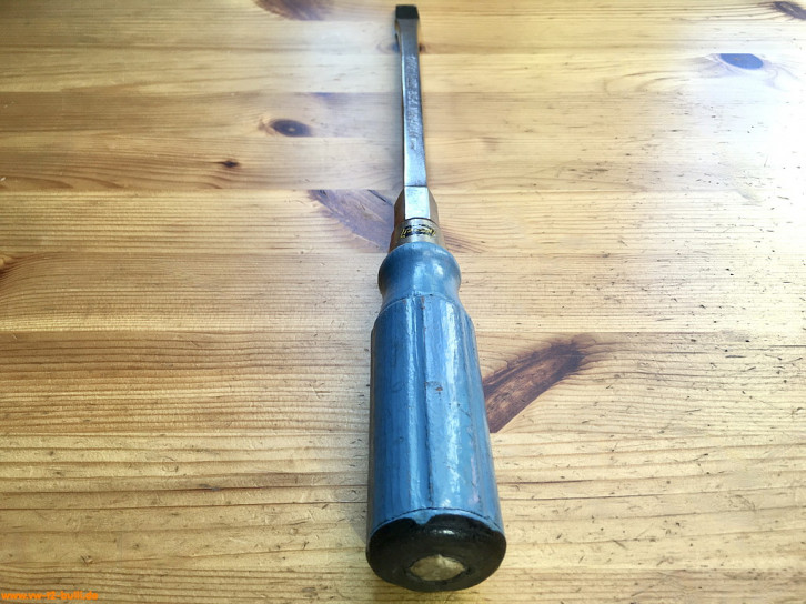 Dieser sehr große Schraubendreher ist mit blauem Holzgriff und durchgehender Vierkantklinge mit Sechskant, gesenkgeschmiedet war nicht Teil von Werkzeugschränken. Die Länge vor dem Griff ist 250 mm, die Gesamtlänge 390 mm, die Breite der Spitze ist 14 mm.