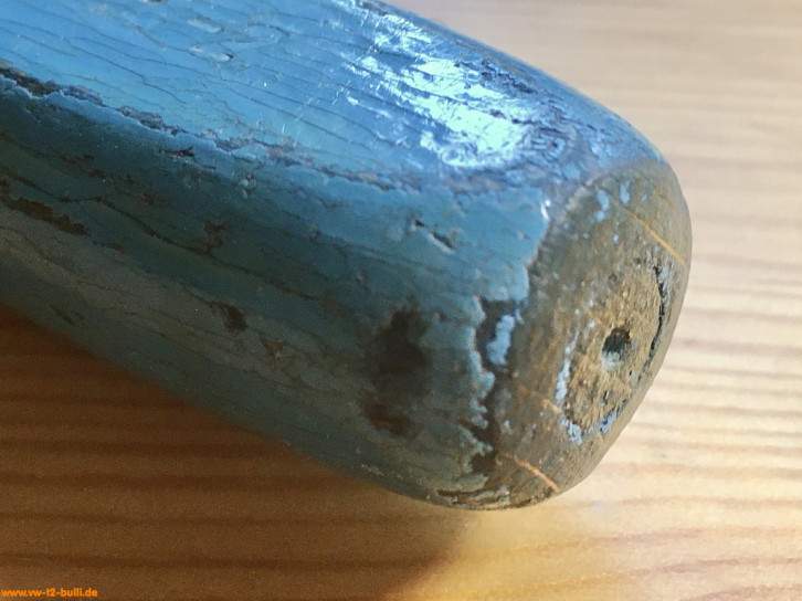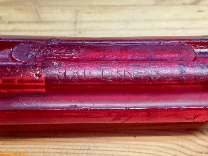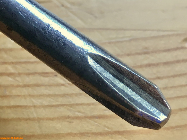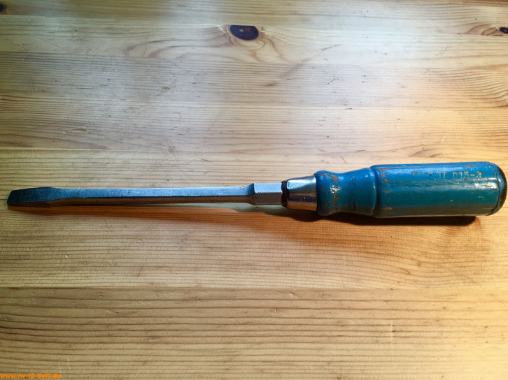 Dieser ca. 210 mm lange Schraubendreher nach DIN 5262 Form A für Kreuzschlitzschrauben (Phillips Recess) der Größen Nr. 5 bis 10 mit runder Klinge und mit blauem Holzgriff gehörte zur HAZET Werkstattausrüstung für luftgekühlte VWs bis vor 1972 - danach durch 835 mit gelbtransparenten Kunststoffgriff ersetzt. Er war auch Teil des 3-teiligen Kreuzschlitzschrauben-Sets für VW 575/3 von 1954 bis vor 1958 bzw. 2575/3 1958 bis 1969.