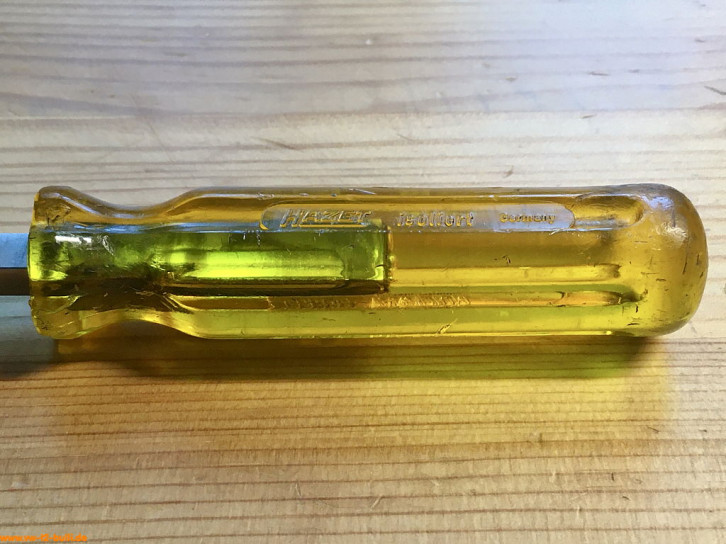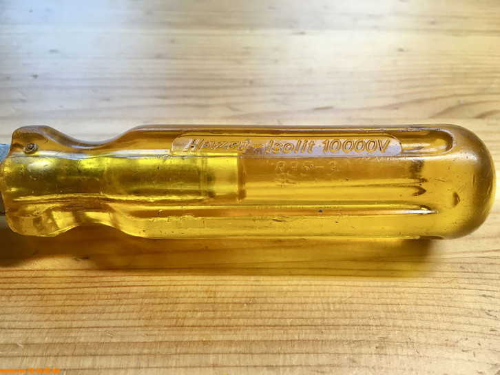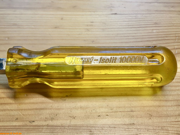 Aufschriften sind auf dem Griff "Hazet - Isolit 10000V", "ges. gesch. Germany" für "gesetzlich geschützt" - und auf dem Schaft "CHROM Hazet 832-6 VANADIUM".