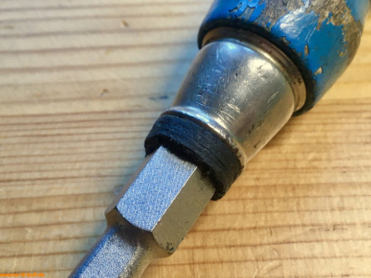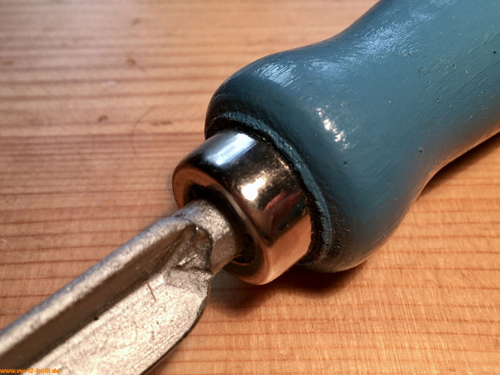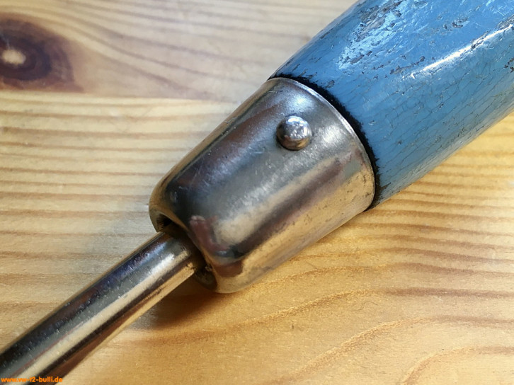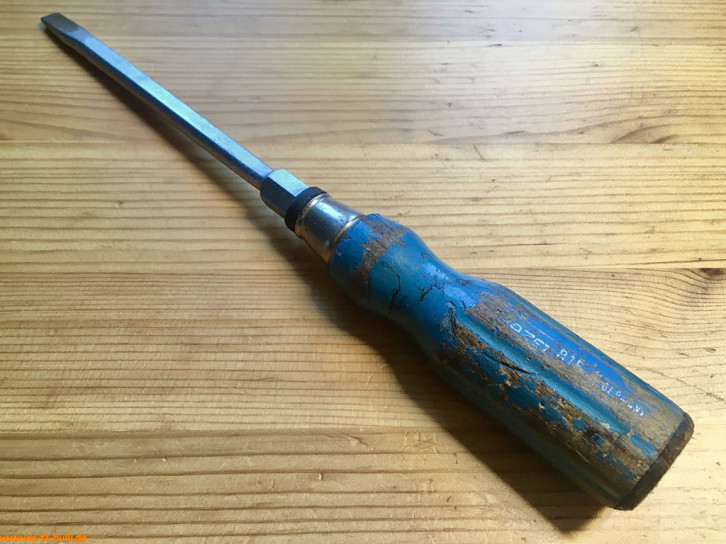 Dieser große Schraubendreher ist mit blauem Holzgriff und durchgehender Vierkantklinge mit Sechskant, gesenkgeschmiedet war Teil von Werkzeugschränken. Die Länge vor dem Griff ist 110 mm, die Gesamtlänge 230 mm, die Breite der Spitze ist 7 mm.