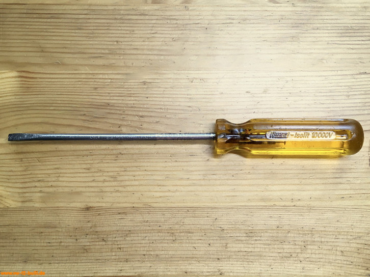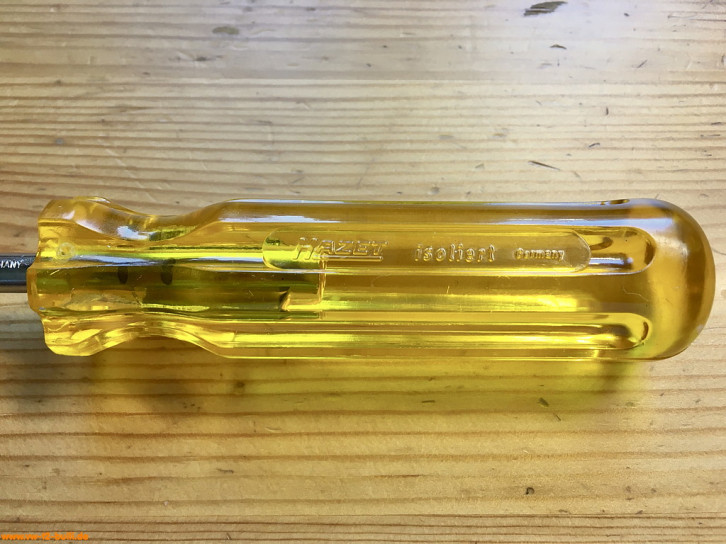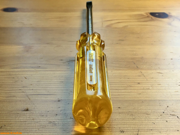 Dieser Schraubendreher DIN 5262 für Kreuzschlitzschrauben (Phillips Recess) mit runder Klinge und Transparentgriff in gelb ist isoliert bis 10000V und gehörte zur HAZET Werkstattausrüstung für luftgekühlte VW und auch andere Fahrzeuge. Die Länge vor dem Griff ist 80 mm, Gesamtlänge 168 mm, die Spitze ist für DIN 5262 - Größe 1 (USA 2-4).