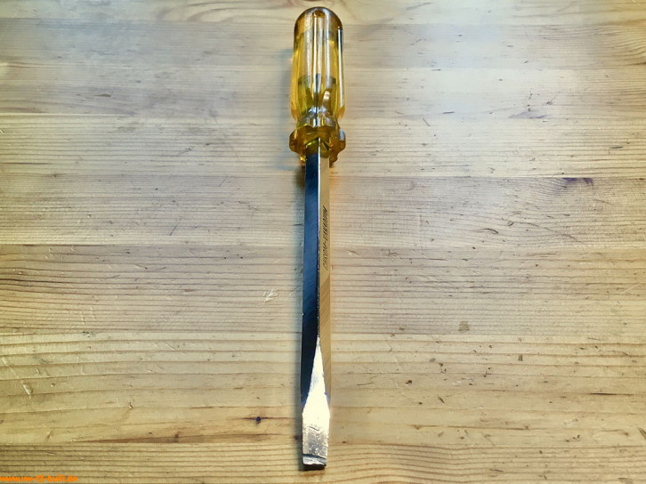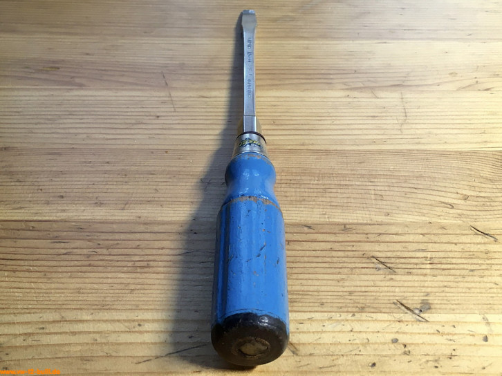 Dieser große Schraubendreher ist mit blauem Holzgriff und durchgehender Vierkantklinge mit Sechskant, gesenkgeschmiedet war Teil von Werkzeugschränken. Die Länge vor dem Griff ist 175 mm, die Gesamtlänge 305 mm, die Breite der Spitze ist 10 mm.