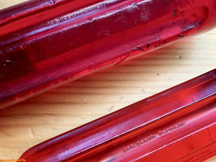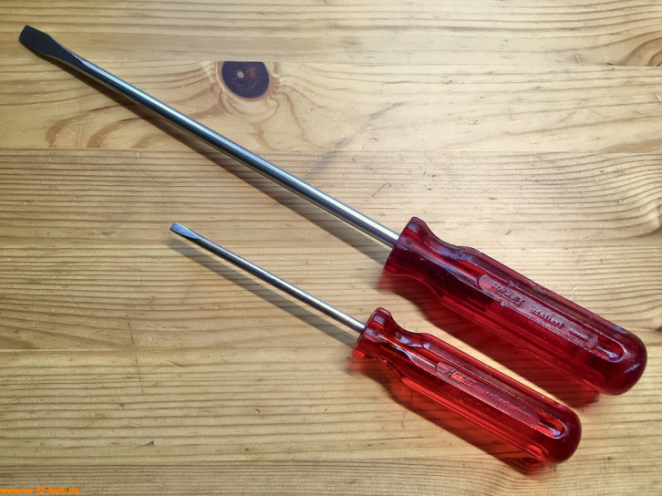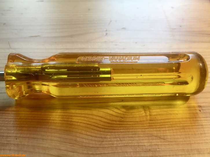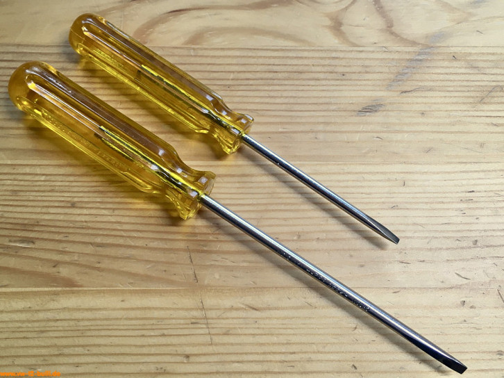 Diese Schraubendreher mit runder Klinge und Transparentgriff in rot sind isoliert, nach DIN 5265 Form A und waren weder Teil von Werkzeugschränke noch von VW Sets. Hier die Größen 5 und 8 - bei Größe 5 mit Gesamtlänge 220 mm ist die Länge vor dem Griff 125 mm, die Breite der Spitze ist 4,5 mm, bei Größe 8 mit Gesamtlänge 315 mm ist die Länge vor dem Griff ist 200 mm, die Breite der Spitze ist 8 mm.