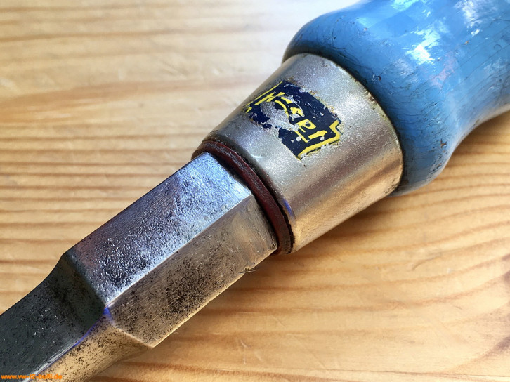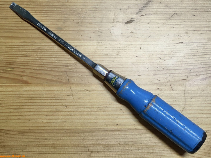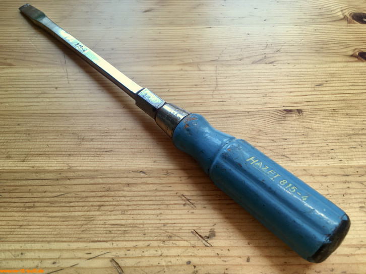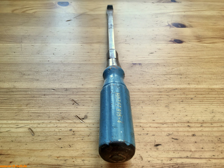 In HAZET Katalogen gibt es ihn auch schon ab 1963. Und erst 1976 erscheint der "HAZET 815-3" Schriftzug auf dem Griff (vorher im Katalog auf der Klinge). Bis vor 1976 ist die Spitze 9 mm breit, danach in den Katalogen als 8 mm breit geführt. Bis mindestens 92 findet man ihn noch, in den Katalog von 2000 nicht mehr in blau aber mit Holzgriff - aber in 2020 Katalogen nicht mehr.