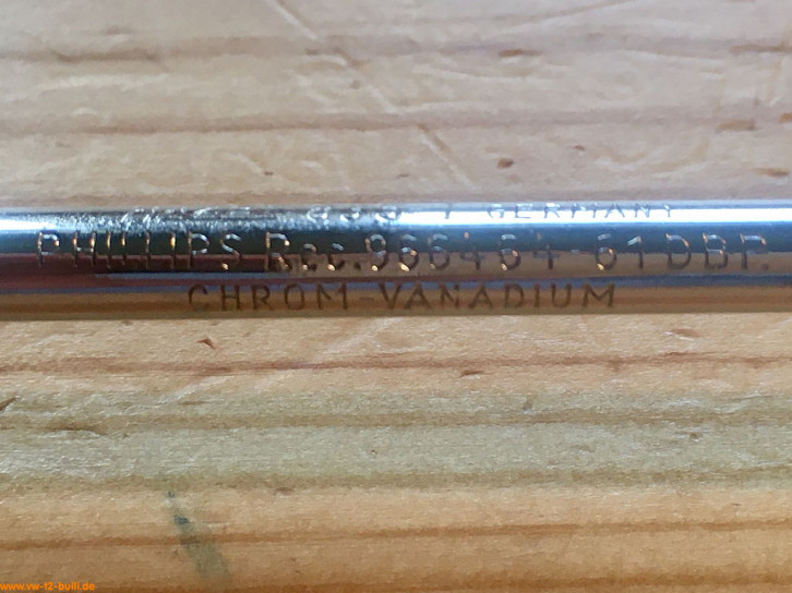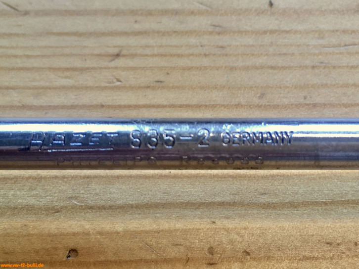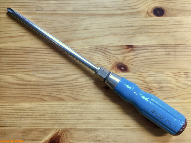 Dieser ca. 275 mm lange Schraubendreher nach DIN 5262 Form A für Kreuzschlitzschrauben (Phillips Recess) der Größen Nr. 12 bis 16 mit runder Klinge und mit blauem Holzgriff gehörte zur HAZET Werkstattausrüstung für luftgekühlte VWs bis vor 1972 - danach durch 835 mit gelbtransparenten Kunststoffgriff ersetzt. Er war auch Teil des 3-teiligen Kreuzschlitzschrauben-Sets für VW 575/3 von 1954 bis vor 1958 bzw. 2575/3 1958 bis 1969.