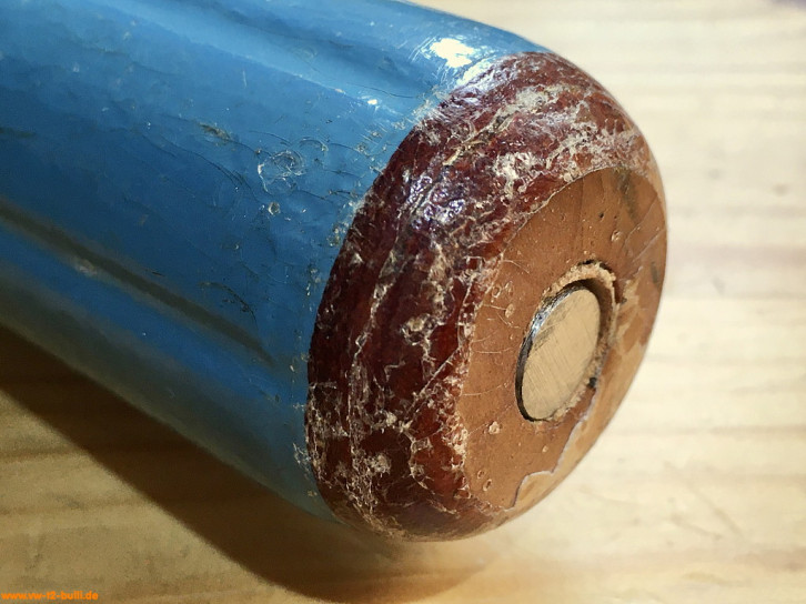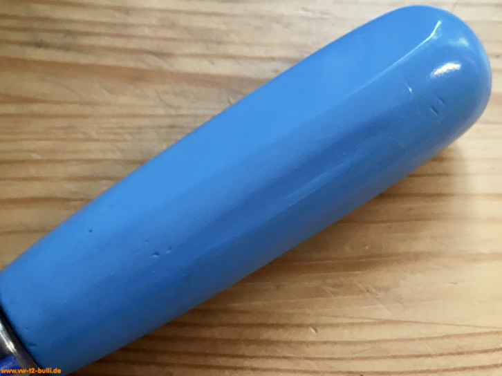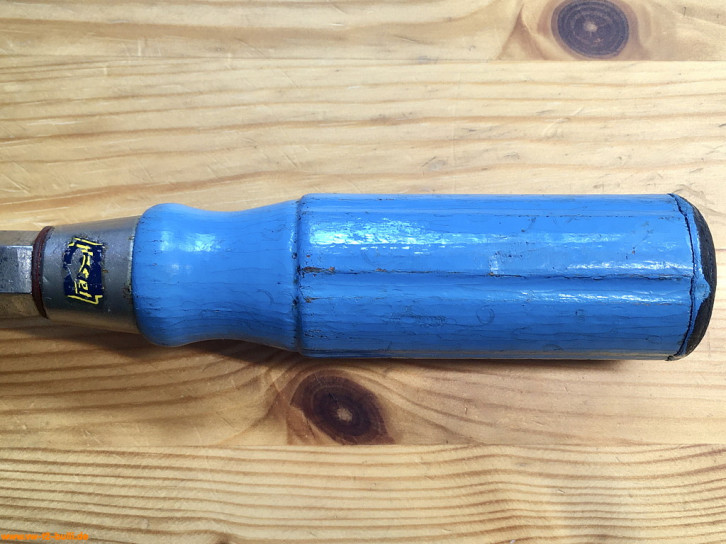 In HAZET Katalogen gibt es ihn auch schon ab 1950. Bis vor 1969 ist der Griff in braunem Holz-natur, dann ab 1969 wie hier in blau bis 1985, danach 1992 schwarz und 2000 bis heute wieder in braunem Holz-natur.