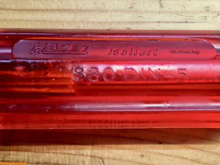 Aufschriften sind auf dem Griff je "HAZET isoliert Germany" und "ges. gesch. Germany" für "gesetzlich geschützt" und "830 DIN-5" bzw. "830 DIN-8".