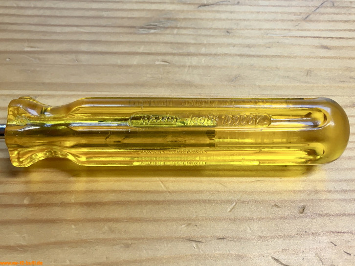 Aufschriften sind auf dem Griff "Hazet - Isolit 10000V", "ges. gesch. Germany" für "gesetzlich geschützt" - und auf dem Schaft "CHROM Hazet 832-4 VANADIUM".