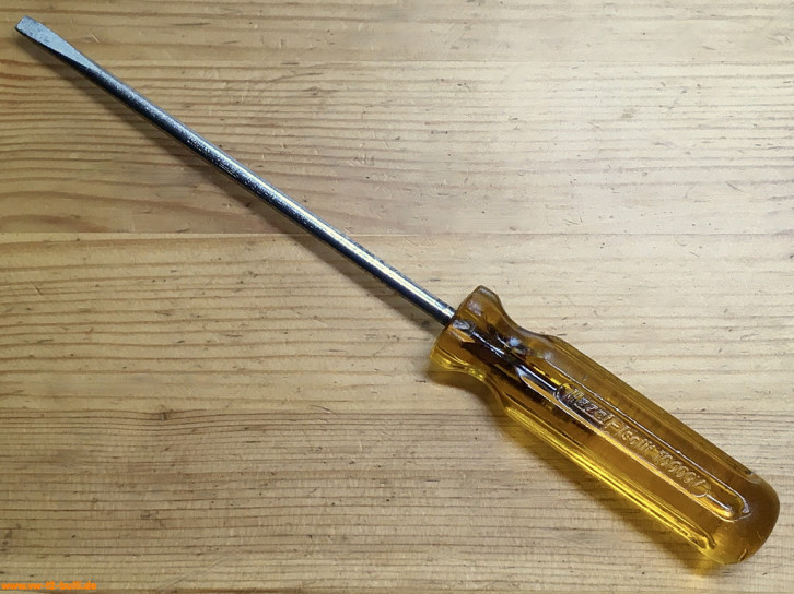 Dieser Schraubendreher gehörte zur HAZET Werkstattausrüstung für luftgekühlte VW und war Teil von Werkzeugschränken. Die Gesamtlänge ist 180 mm, die Klingenlänge vor dem Griff ist 100 mm, die Breite der Spitze ist 4 mm.