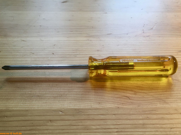 Dieser kleine 145 mm lange Schraubendreher nach DIN 5262 Form A für Kreuzschlitzschrauben (Phillips Recess) mit runder Klinge und mit blauem Holzgriff gehörte zur HAZET Werkstattausrüstung für luftgekühlte VWs bis vor 1972 - danach durch 835 mit gelbtransparenten Kunststoffgriff ersetzt. Diese Größe "814-0" diente unter anderem für Blinkschalter-Schrauben.