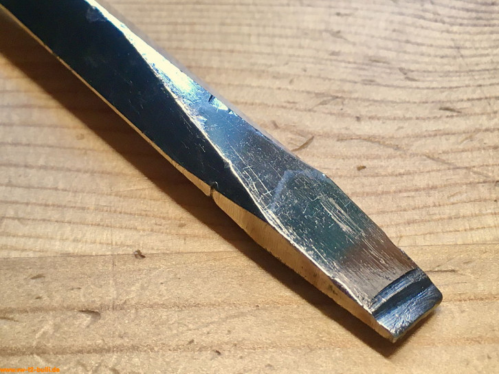 Dieser Dreikant-Hohlschaber mit blauem Holzgriff kann z.B. zum Reinigen von Lagern oder Entgraten von Bohrungen verwendet werden. Das untere Drittel ist messerscharf und pfeilspitz. Er gehörte zur HAZET Werkstattausrüstung für luftgekühlte VW und auch andere Fahrzeuge. Die Länge vor dem Griff ist 150 mm, die Gesamtlänge 265 mm.