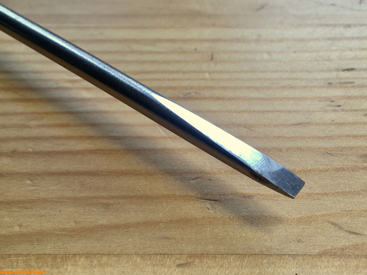 Dieser kurze Schraubendreher für Vergaser gehörte zur HAZET Werkstattausrüstung für luftgekühlte VW und auch andere Fahrzeuge. Die Länge vor dem Griff ist 25 mm, die Breite der Spitze ist 10 mm.