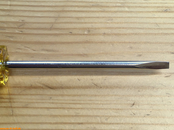 Dieser Schraubendreher war Teil von Werkzeugschränken. Die Gesamtlänge ist 135 mm, die Klingenlänge vor dem Griff ist 60 mm (hier eher 64 mm), die Breite der Spitze ist 2,5 mm.