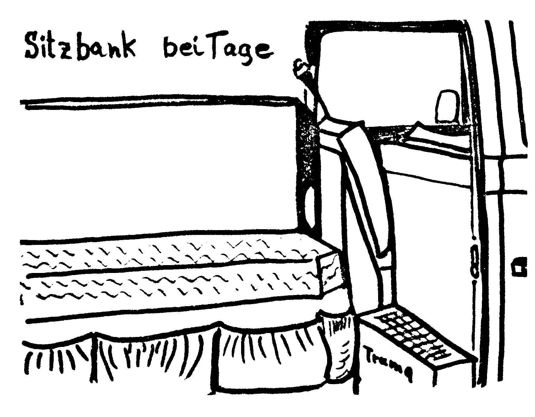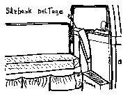 Kommt man jedoch in die "besseren Jahre", so braucht man seine 10 cm Dunlopillo-Matraze. In unserem Wagen haben wir an der linken Innenwand 2 Schlafkojen angebracht, die tagsüber als Sitzbank dienen.