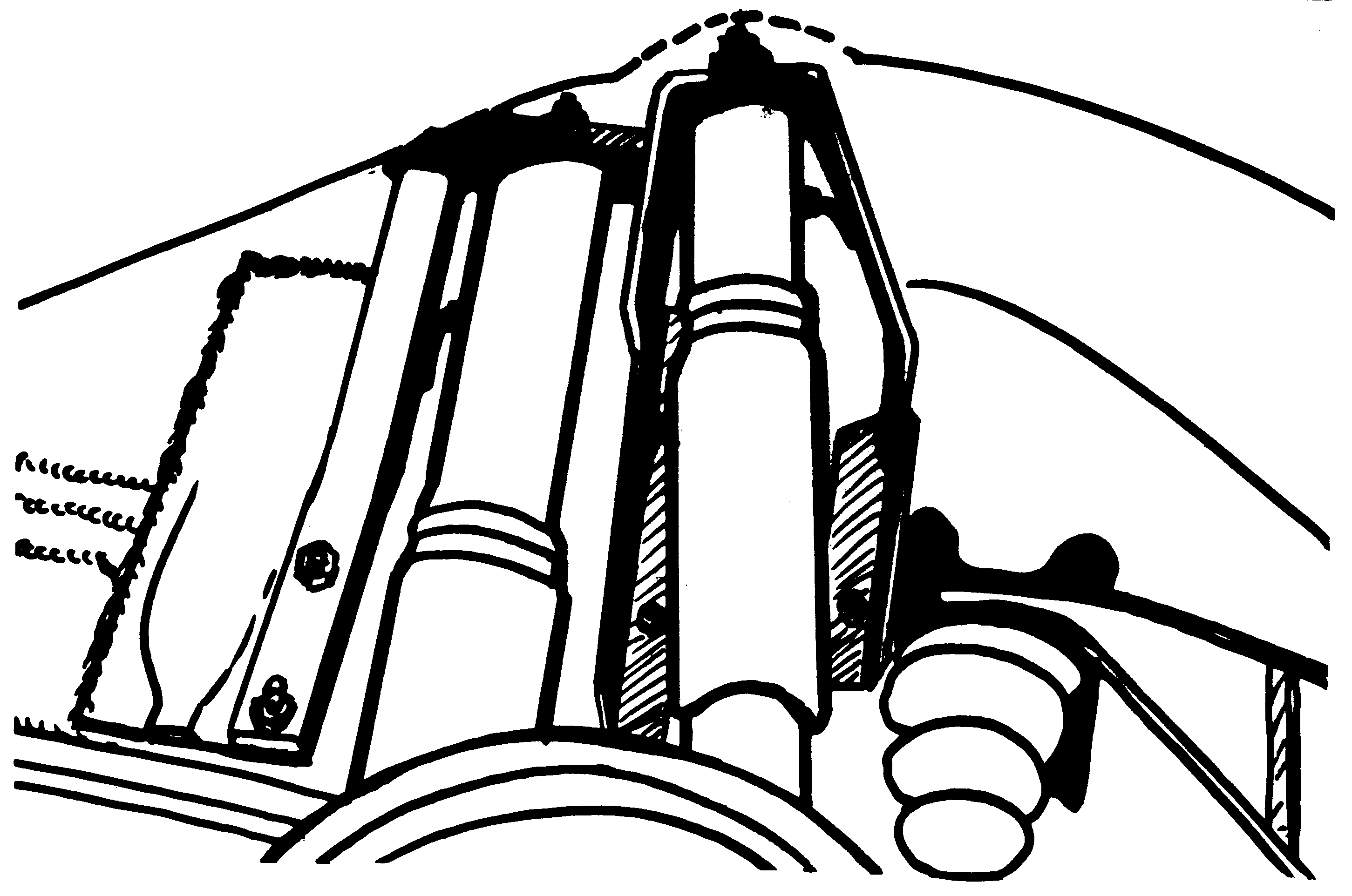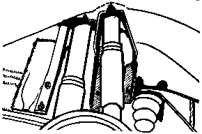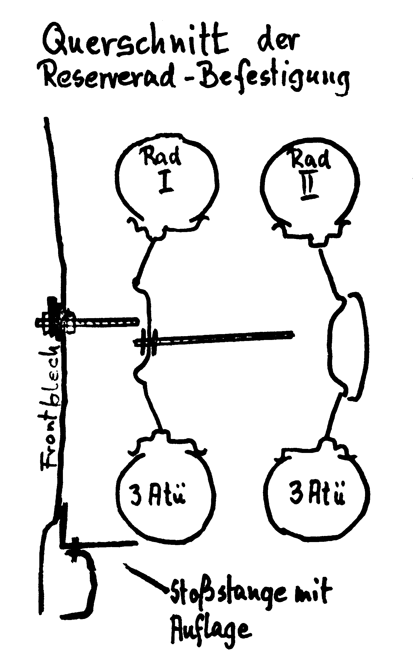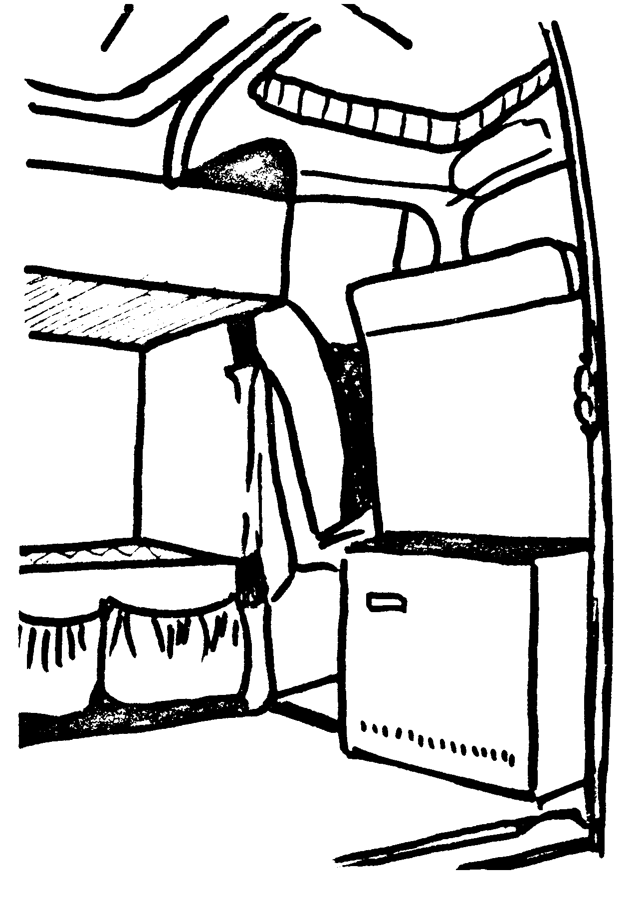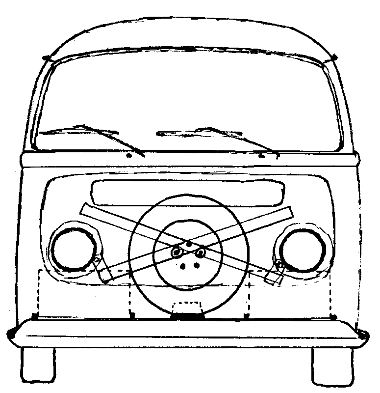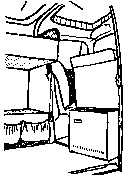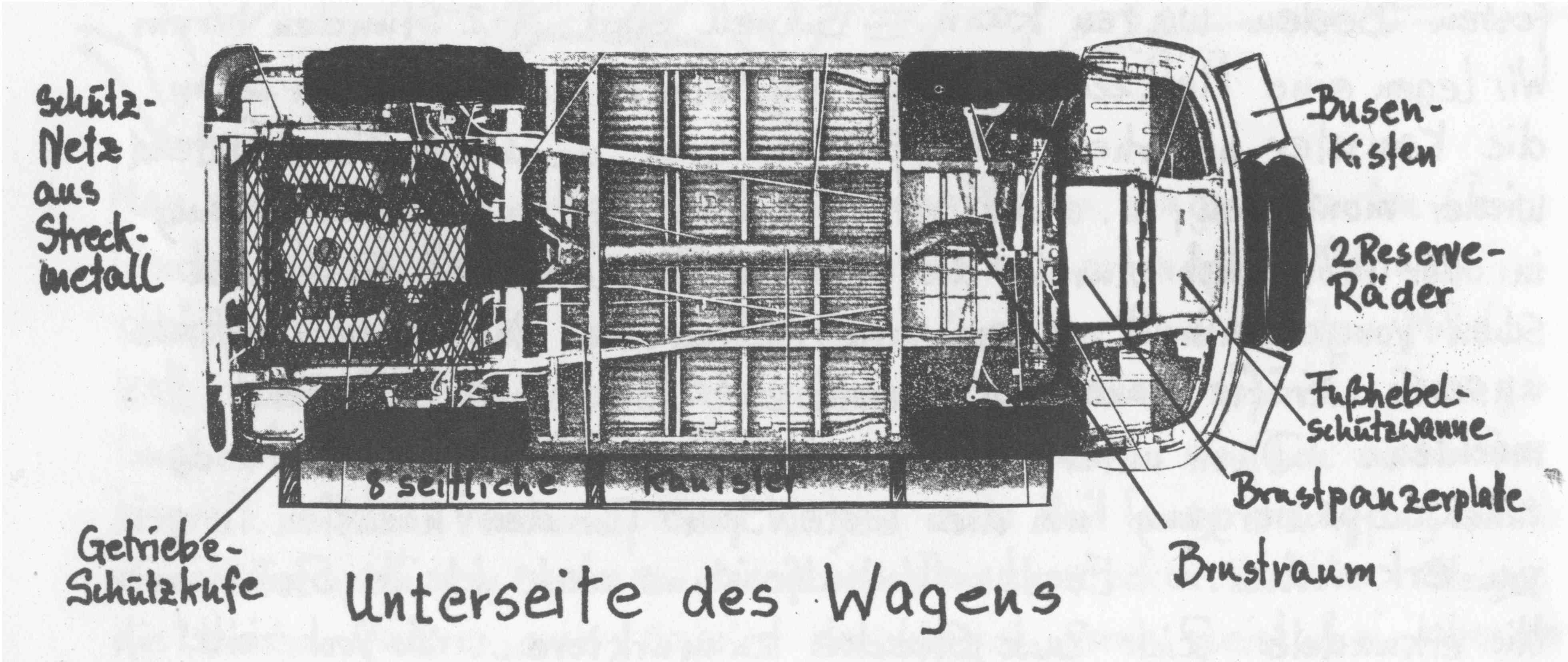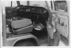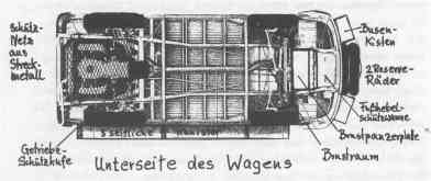 Auf weiterer Suche nach Stauraum findet man unter den Fahrersitzen, vom Durchgang aus zu erreichen, schöne Fächer für sperriges Werkzeug wie Wagenheber (empfehlenswert sind 3 Stück), Eisensäge, Reifen-Montierhebel usw.. Sie brauchen nur die Blechrippen herauszuschneiden u. Klappen davor zu machen. Abschlepp-Drahtseile finden einen anspruchslosen Platz unter der Sitzfläche des Beifahrers. Vor der Steuersäule, vor den Knien des Fahrers bis hinauf zum Schaltbrett kann man etwas weiches oben anbinden, wie Sonnendach oder Air-Bag-Wagenheber.