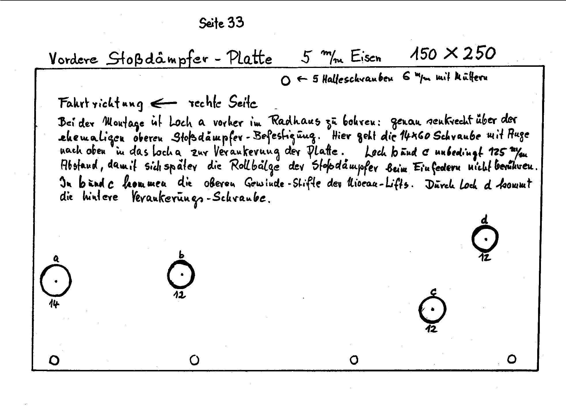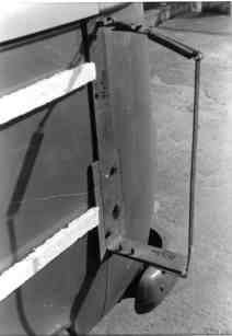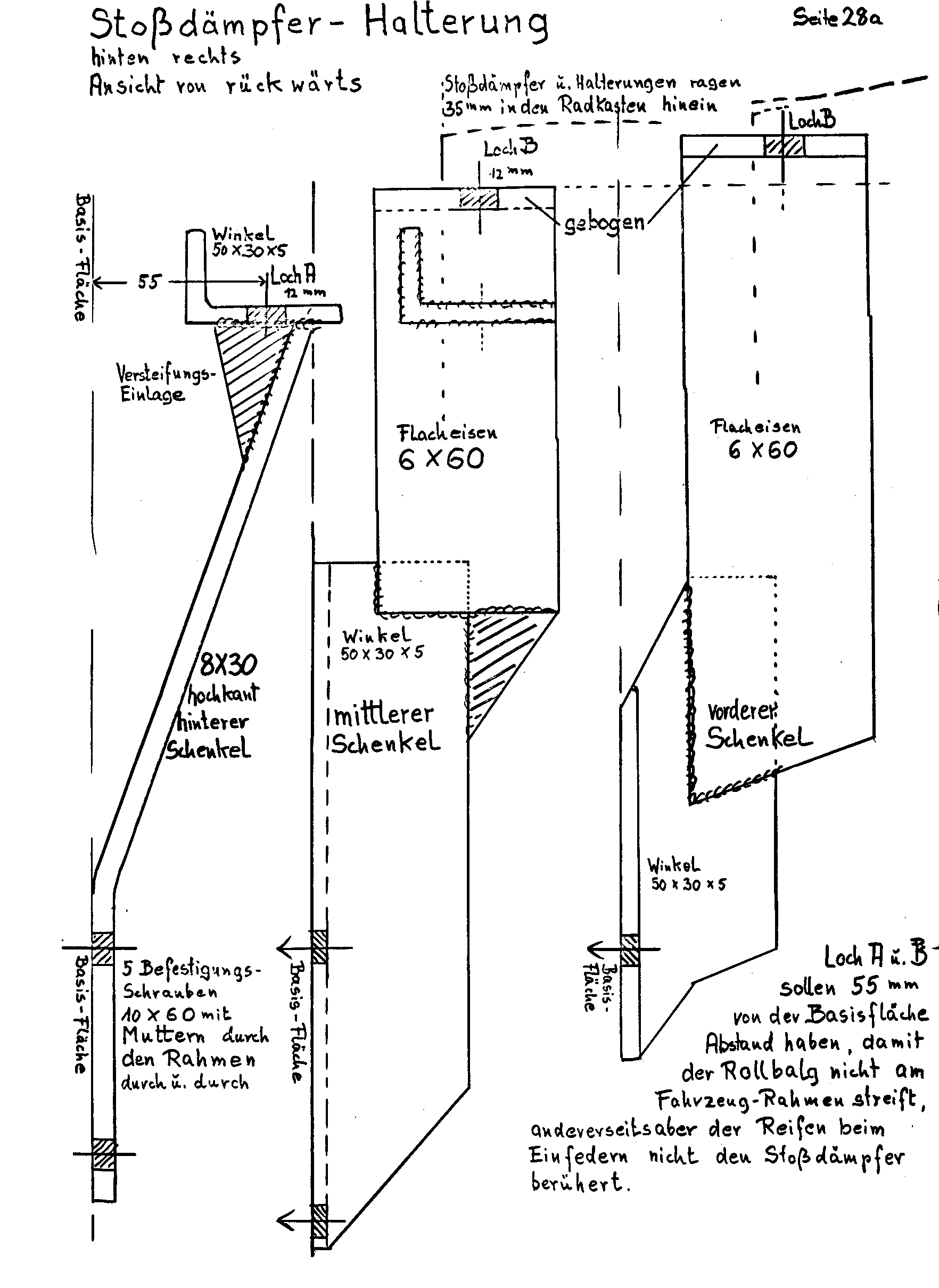 Um im Wagen mehr Platz zu gewinnen mußten die Benzin-Kanister außen angebracht werden. Vom Dachträger halte ich zwar nicht viel, außer zum Schattenspenden und Schlafen. Aber zum Beladen mit vollen Benzin-Kanistern? Das bringt den Schwerpunkt zu hoch. Und wohin diese langen Lochbleche? Das Foto zeigt es. An die linke Seitenwand werden Flacheisen geschraubt, die unten in einen rechtwinklg abstehende Konsole übergehen. Hiervon werden 3 Stück an der Seitenwand befestigt. Die 8x80 mm Schrauben müssen durch die senkrechten Karosserie-Träger durch und durch gehen, also Muttern innen im Auto. Der vordere Träger geht gleich hinter der Tür vom Wagenheberloch aus senkrecht hinauf. Daran sind innen auch die Sicherheitsgurte befestigt. Der zweite Träger geht vom hinteren Wagenheber-Vierkantloch senkrecht hinter der Naht nach oben. Der dritte Träger hinten findet seine Befestigung nur im Bereich der gepfalzten Naht; Oben 2 Schrauben durch u. durch, unten nur kurze Schrauben durch das Blech. In Deutschland kommen in die Bohrlöcher kleine Gummistöpsel und der TÜV sieht nichts mehr.