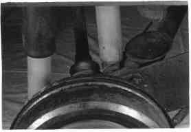 Reifenpannen werden von mir meist sofort geflickt, dann entfällt die 2fache Radmontage, und flicken muß man ja am Abend sowieso. Die recht schwierige Arbeit, den Reifen aus der Felge zu lösen, habe ich jetzt endlich im "Griff": Mit einem 2. Wagenheber oder Unterstellbock wird der Wagen abgestützt. Für den VW-Wagenheber habe ich in die Sohlenplatte einsteckbar einen Zusatz aus 6x60mm Flacheisen, hochkantig.