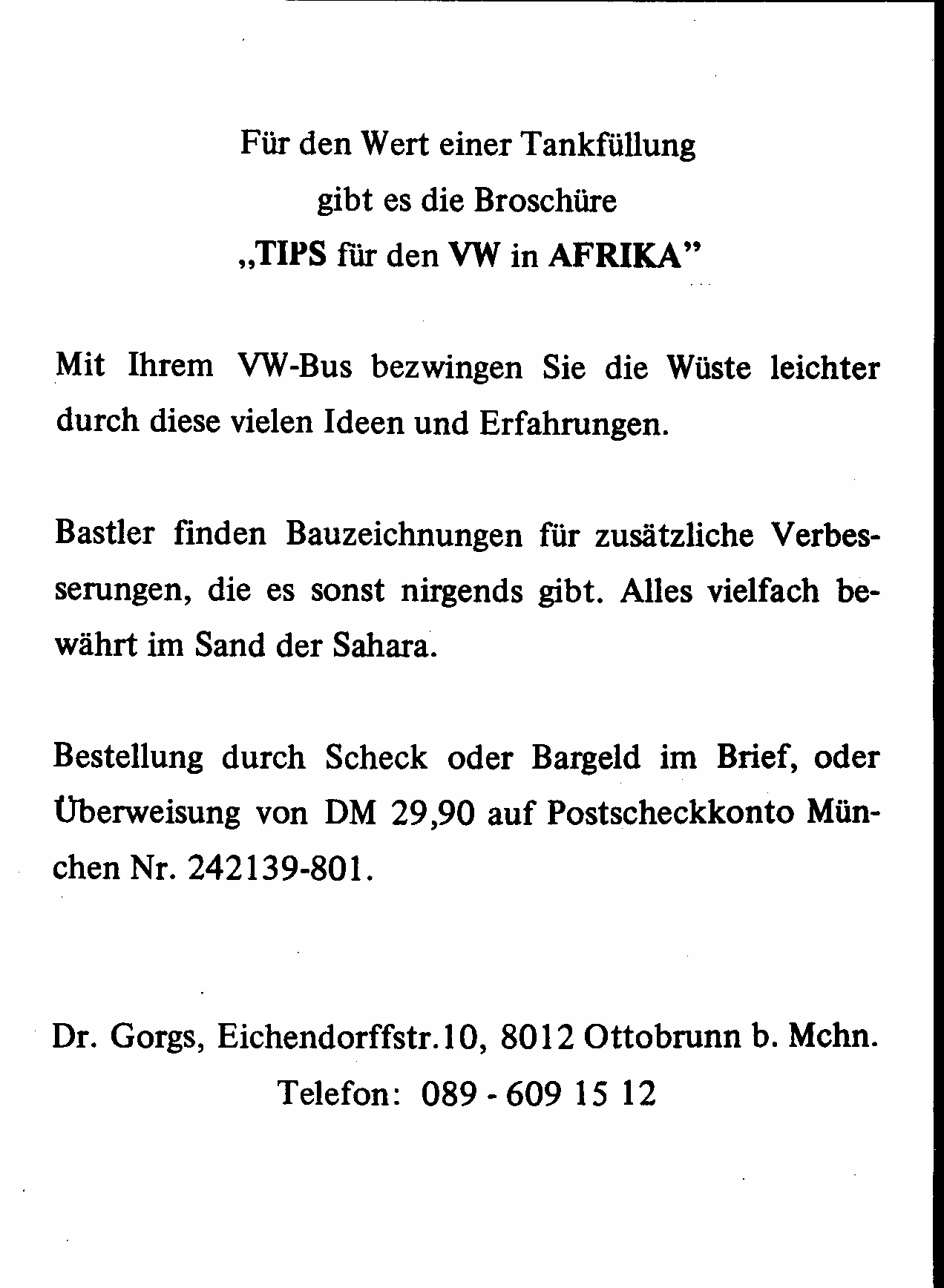 Für Leute, die kein Afrika-Auto anschaffen wollen, seien einige Abenteuer-Reisen genannt: Otto Reitzig, 819 Wolfratshausen, Münsingerstr. 9, Tel: 08171-8364