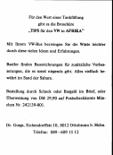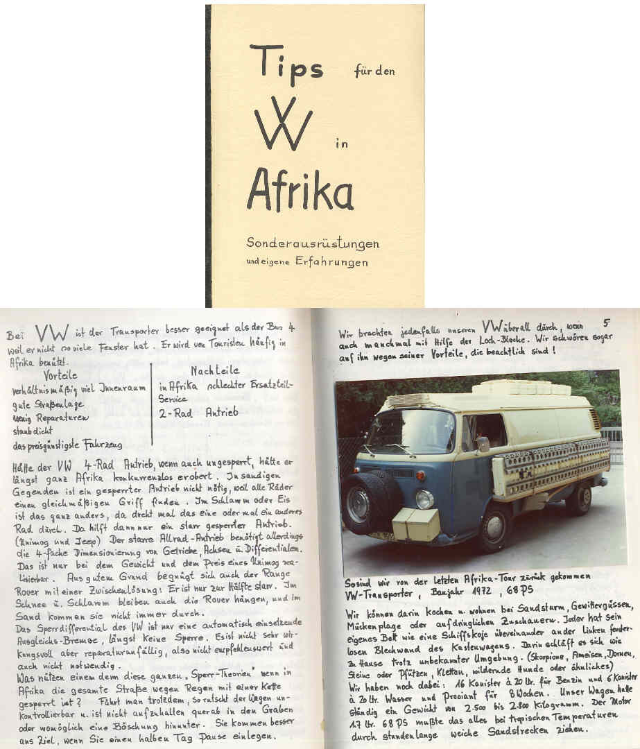 Ebenfalls sollten Sie sich vom Volkswagenwerk AG 318 Wolfsburg schicken lassen: "Die Tropenanleitung für VW-Transporter". Darin sind einige brauchbare Verhaltens-Tips angegeben u. im Teil C eine Liste von Zusatz-Ausrüstungen, die das VW-Werk liefert. Besonders ankreuzen möchte ich da: Nebenstrom-Ölfilteranlage mit Wegwerftopf, zusätzliche Motorraum-Abdichtung, Abdichtscheibe für Zündverteiler gegen Staubeintritt, verstärkte Stoßdämpfer, tropenfest, besser sind Bilstein-Gasdruck-Stoßdämpfer, am besten sind Niveaulift Stoßdämpfer von Fichtel u. Sachs., Unterflurbleche, Schutzkufe unter dem Gedriebedeckel: 1 Platte Nr. 211.703.835, 2 Bügel 211.703.849, Windschutzscheibe aus Verbundglas, Glühlampensatz. Die weitere Liste der zusätzlichen Ausrüstung un der Ersatzteile stellt nur eine Minimal-Liste dar, die Sie in jedem Fall dabei haben sollten!