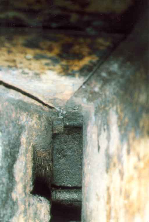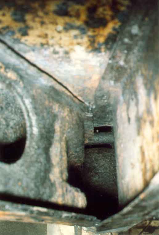 Die Bilder zeigen auf der Beifahrerseite den Blick nach hinten zwischen den sich y-förmig gabelnden Längstrager und Hilfslängsträger zum hier offenen Längstrager. Kritisch ist vor allem der äußere Hohlraum (im Bild links). Auch der offene Längsträger muß behandelt werden, ehe es zu spät ist. Man erkennt hier auch den Bolzen, durch den die Vorderachsbefestigungsschraube führt:
