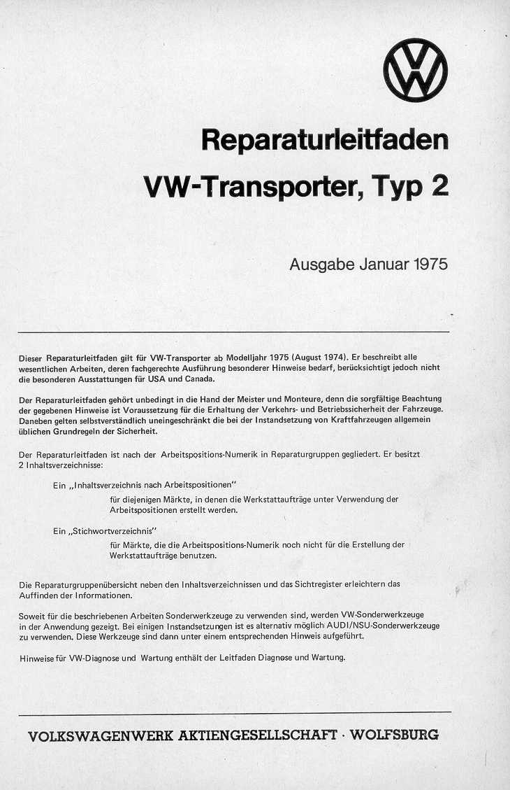 Reparaturleitfaden VW-Transporter Typ 2 Ausgabe Januar 1975, VW 0.00.533.106.00