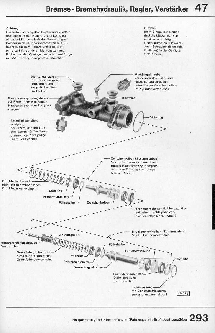 siehe auch: Technisches Merkblatt 13, Bremslichtschalter für Zweikreis-Bremsanlage (September 75),Technisches Merkblatt 29, Hauptbremszylinder der Fa. Teves (Oktober 1976)