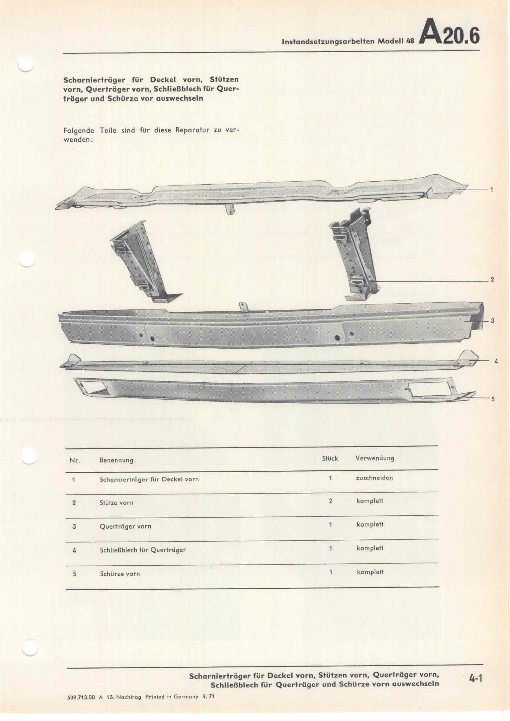 Scharnierträger für Deckel vorn, Stützen vorn, Querträger vorn, Schließblech für Querträger und Schürze vorn auswechseln