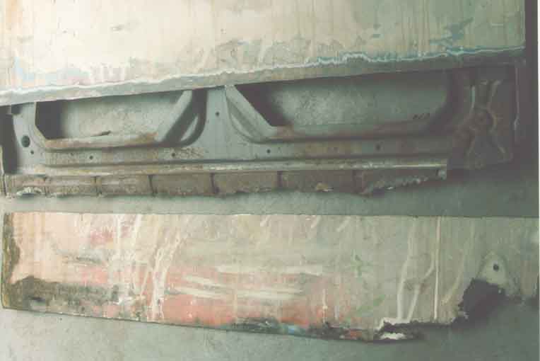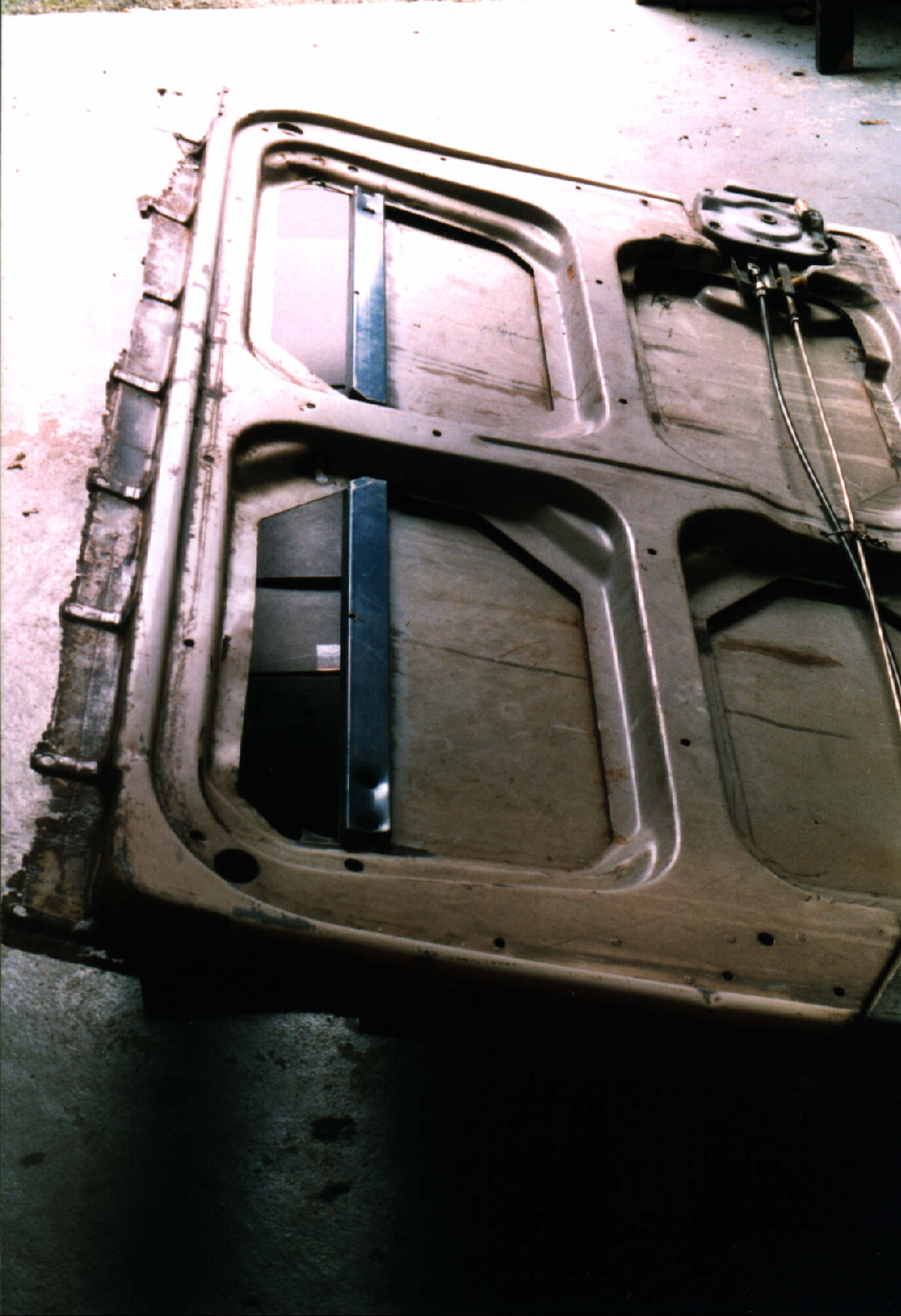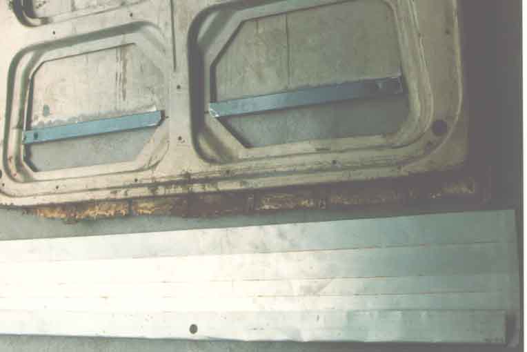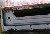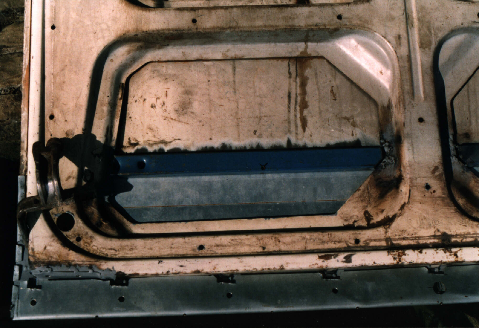 Wenn man auf die Schiebetür ein normales überziehblech setzt, rostets dort natürlich um so schneller. In dem sehr großflächigen Blech ist auch die Verzugsgefahr sehr groß. Ich habe daher das alte Blech abgeschnitten und von innen einen Verstärkungsvierkant eingesetzt, auf dem dann die Bleche stumpf verschweißt werden. Unten wurde auch nicht an der originalen rostgefährdeten Stellen, sondern weiter oben geschweißt. Der ganz unten entstehende Hohlraum ist damit besser korrosionsgeschützt.