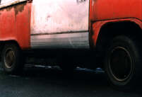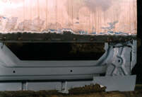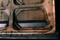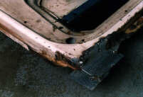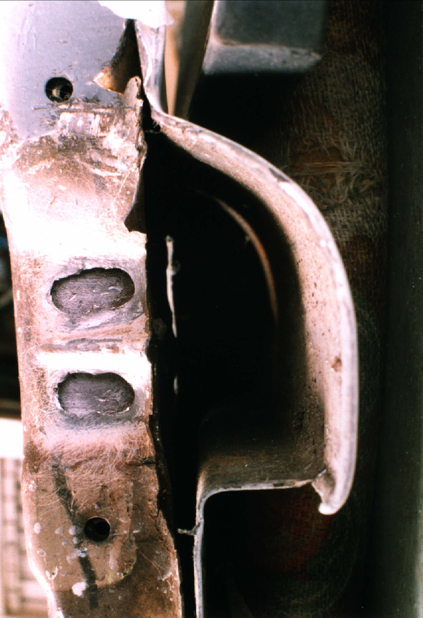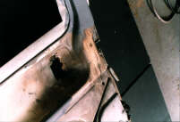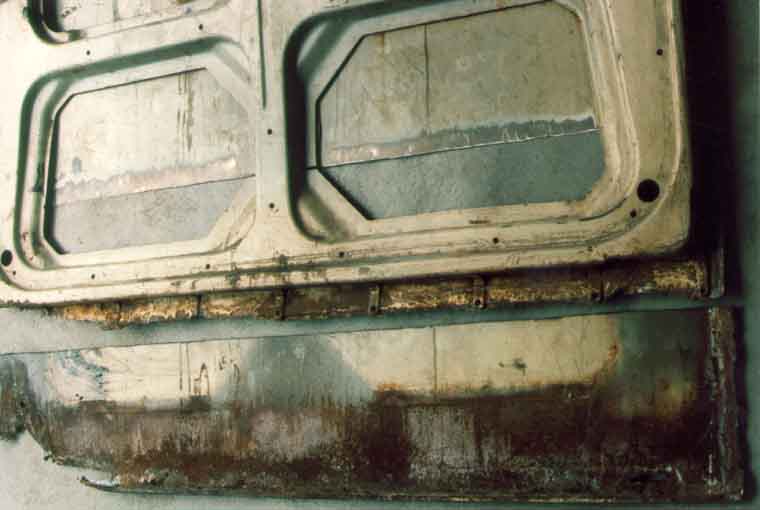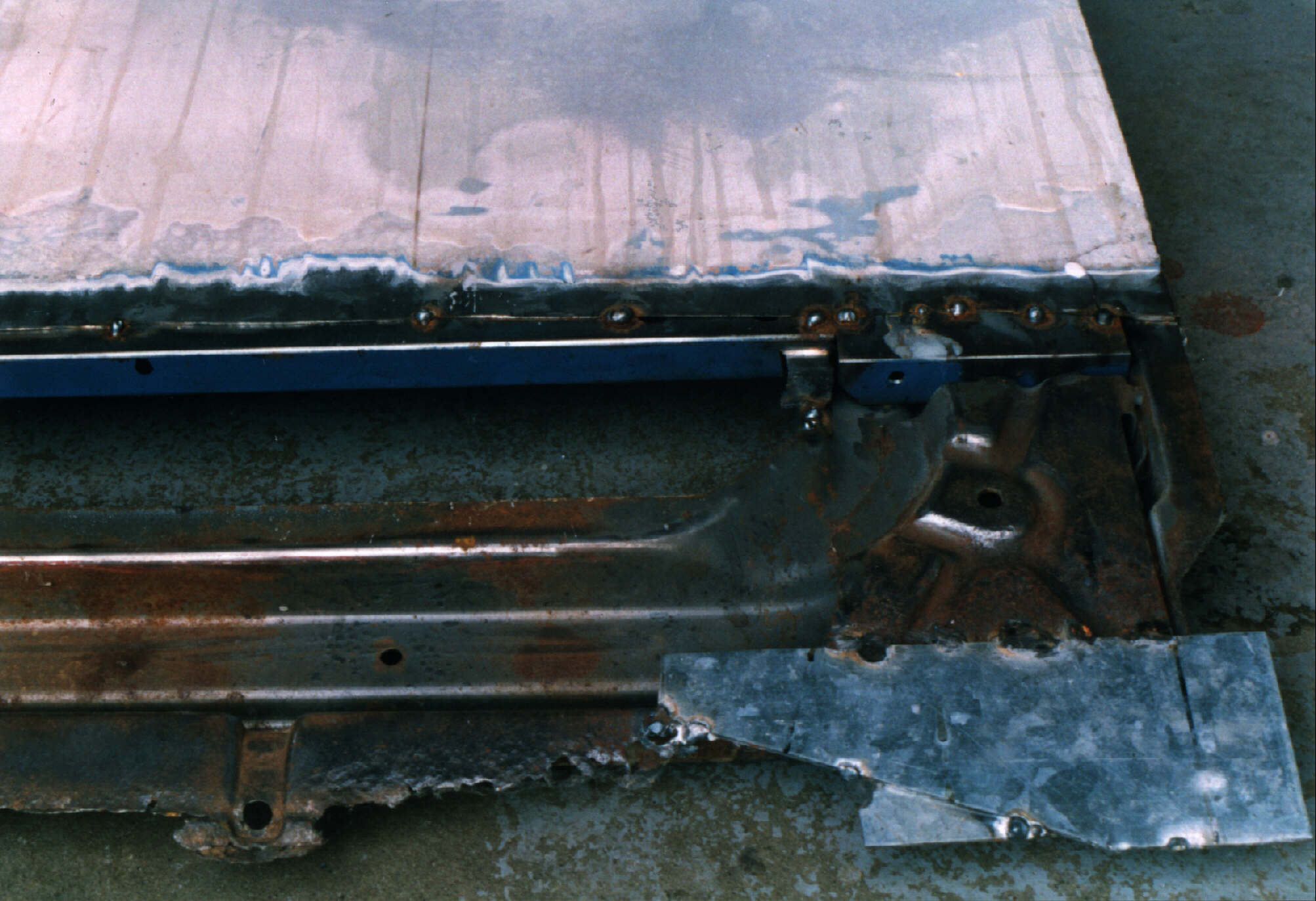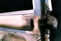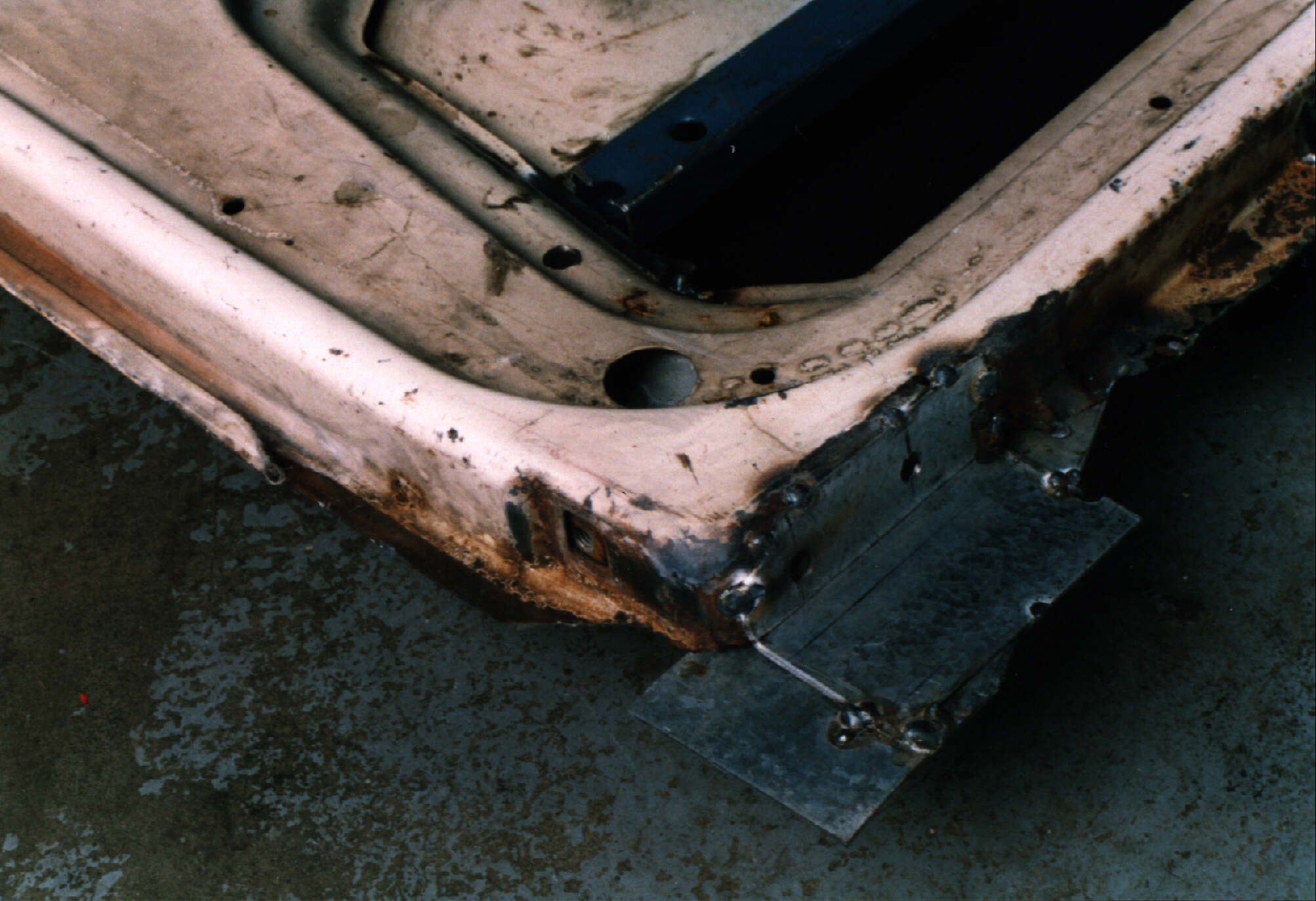 Wenn man auf die Schiebetür ein normales überziehblech setzt, rostets dort natürlich um so schneller. In dem sehr großflächigen Blech ist auch die Verzugsgefahr sehr groß. Ich habe daher das alte Blech abgeschnitten und von innen einen Verstärkungsvierkant eingesetzt, auf dem dann die Bleche stumpf verschweißt werden. Unten wurde auch nicht an der originalen rostgefährdeten Stellen, sondern weiter oben geschweißt. Der ganz unten entstehende Hohlraum ist damit besser korrosionsgeschützt.