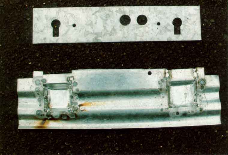 Hier die neue Sitzbankbefestigungsmulde (aus drei Stücken, das Trapezblech aus 1,5mm-Blech gemacht) und die eigentliche Sitzbankbefestigung (2mm). Die runden Löcher dienen übrigens dem Verschweißen der Querträger mit dem Bodenblech.