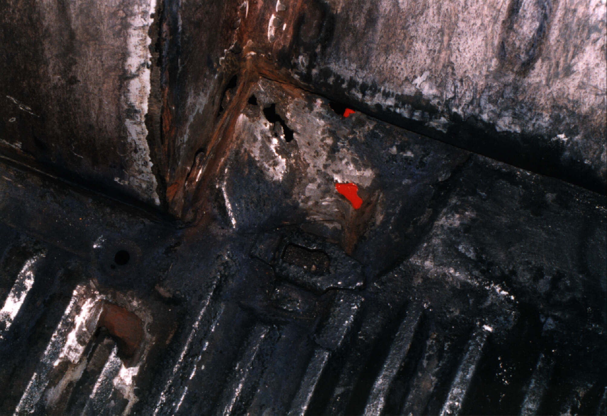 Den äußeren (siehe dazu auch hier) und den inneren rechten Schweller habe ich bereits vor Jahren ausgetauscht. Der Innenschweller war noch gut. Nun war der Schweller-Deckel dran (hinten bereits entfernt, dort sieht man auf den bereits ersetzten Innenschweller). Man sieht auch sehr schön die Bodenblech-Durchrostungen im Bereich der Querträger und den Durchblick durch die Sitzbankbefestigungsmulde: