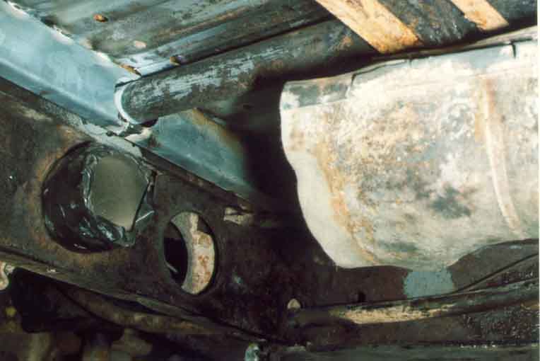 Nun weiter vorbereitet. Man erkennt die Bohrungen für die Verschweißung der neuen Querträger, links das Reparaturstück für das Bodenblech über dem Querträger.
