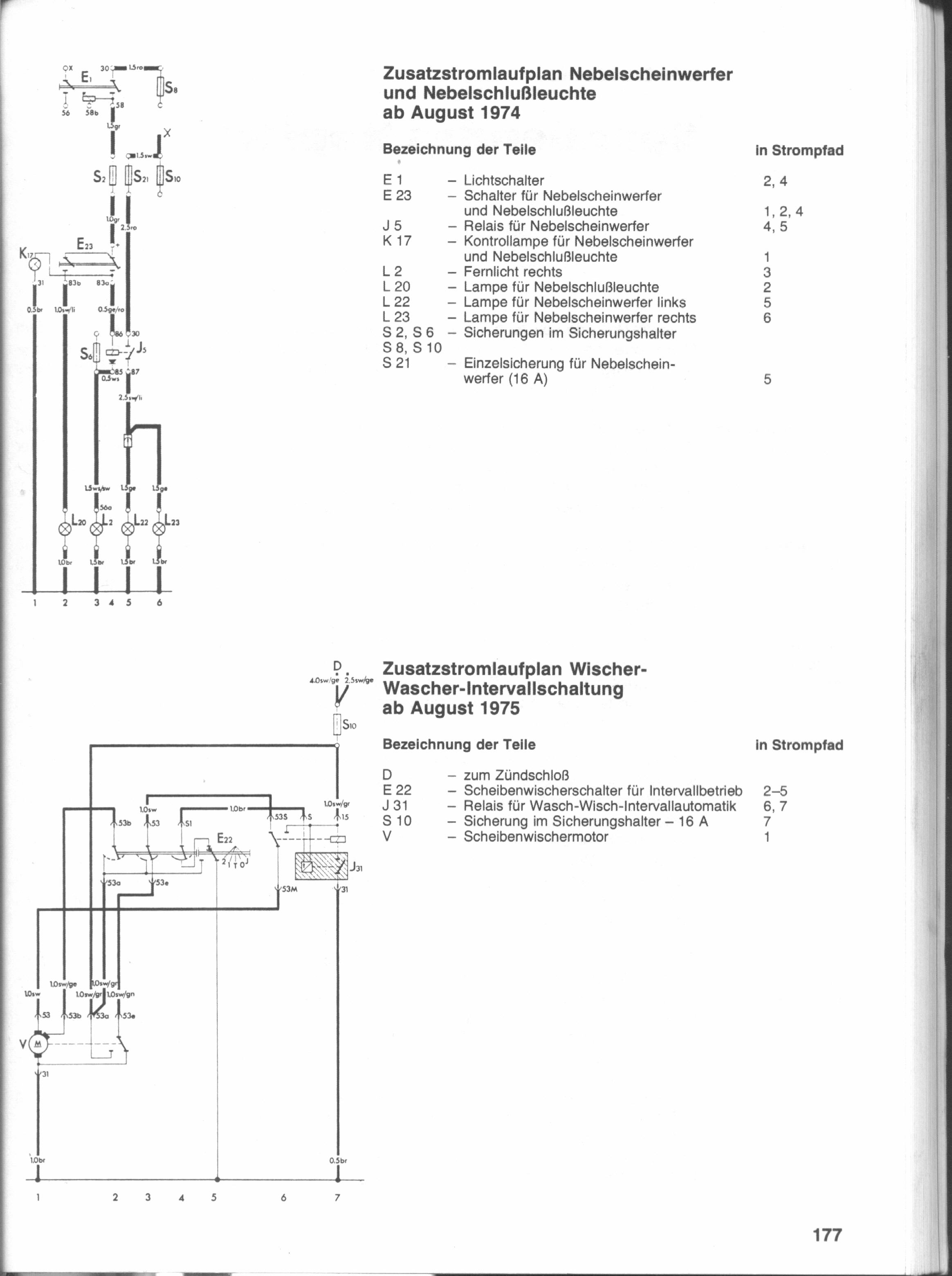 Zusatzstromlaufplan Nebelscheinwerfer und Nebelschlußleuchte ab August 1974 / Wischer-Wascher-Intervallschaltung ab August 1975