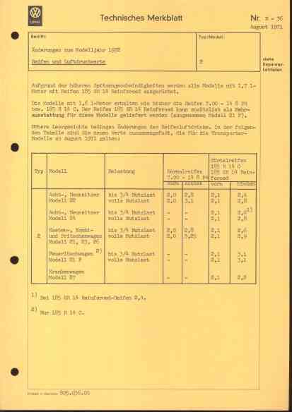 Änderungen zum Modelljahr 1972 - Reifen und Luftdruckwerte