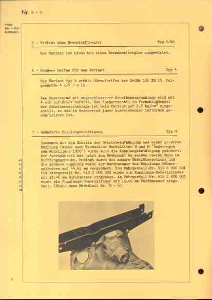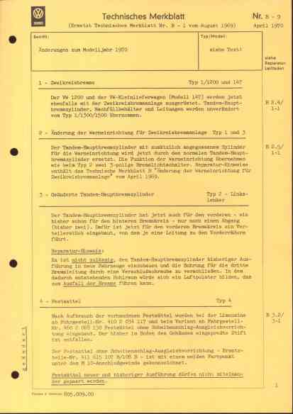 B - 9 | Änderungen zum Modelljahr 1970 1 - Zweikreisbremsanlage für VW 1200 und Modell 1472 - Änderung der Warneinrichtung für Zweikreisbremsanlage3 - Geänderte Tandem-Hauptbremszylinder4 - Festsattel - Scheibenschlag-Ausgleichsvorrichtung5 - Variant ohne Bremskraftregler6 - Größere Reifen für den Variant7 - Geänderte Kupplungsbetätigung | 1/1200, 147 1, 3 2/Linkslenker 4 46 4 | | B1.8/1-5, B1.1/2-16, B2.2/1-2, B3.2/3-14, B1.8/1-5, B1.8/1-5, B1.8/1-5 |