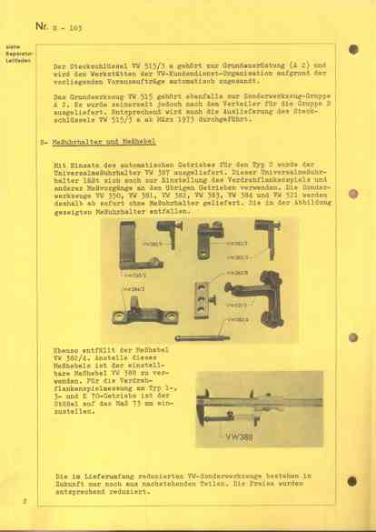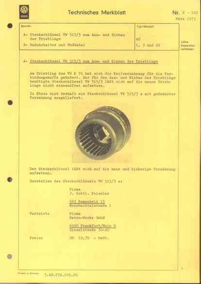 Steckschlüssel VW 515/3 zum Aus- und Einbau des Trieblings / Meßuhrhalter und Meßhebel - - März 1973